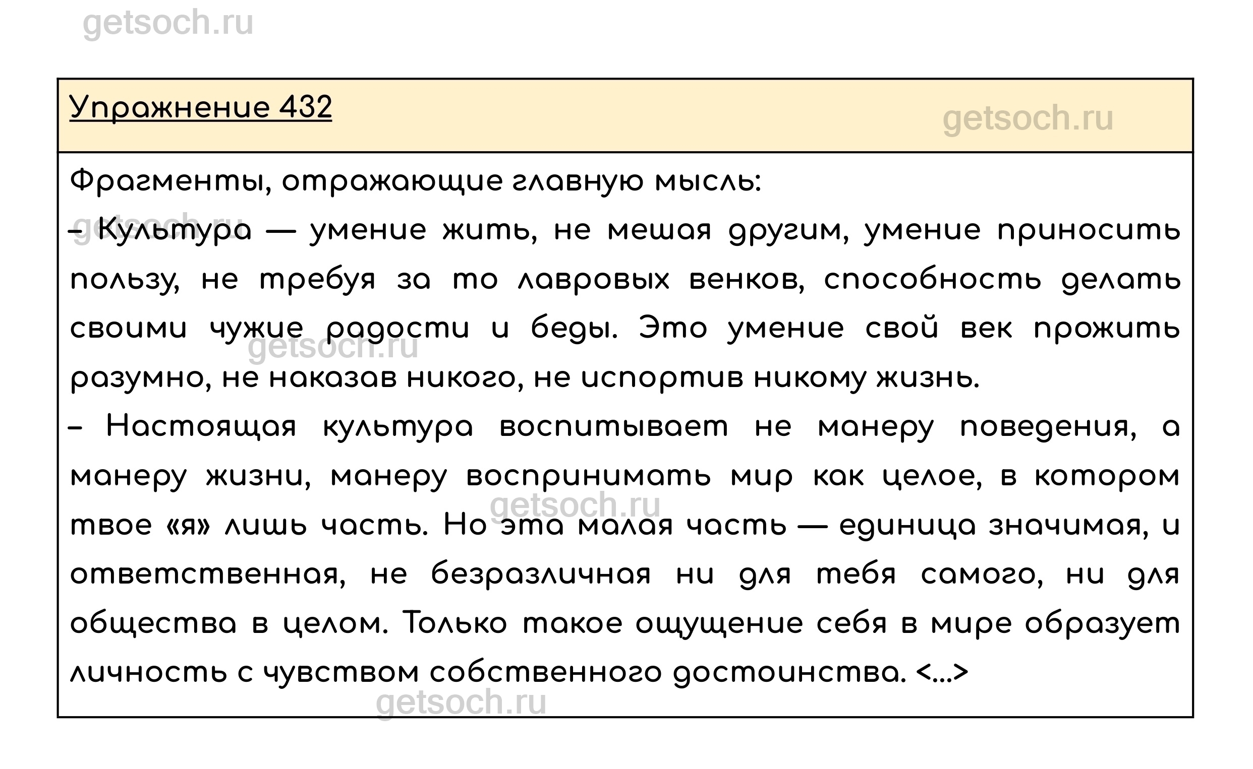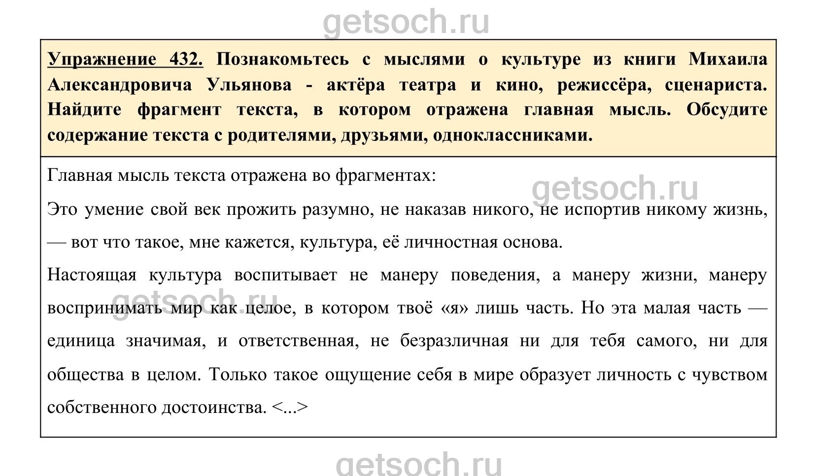 Упражнение 432. Познакомьтесь с мыслями о культуре из книги Михаила Александровича Ульянова – актёра театра и кино, режиссёра, сценариста. Найдите фрагмент текста, в котором отражена главная мысль. Обсудите содержание текста с родителями, друзьями, одноклассниками.