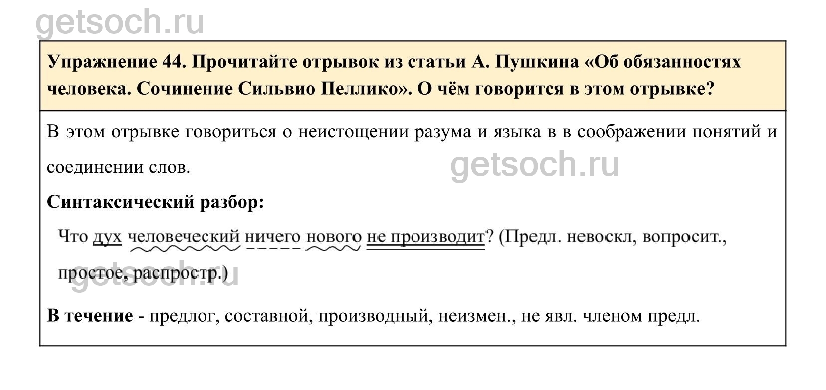 Упражнение 44. Прочитайте отрывок из статьи А. Пушкина «Об обязанностях человека. Сочинение Сильвио Пеллико». О чём говорится в этом отрывке?