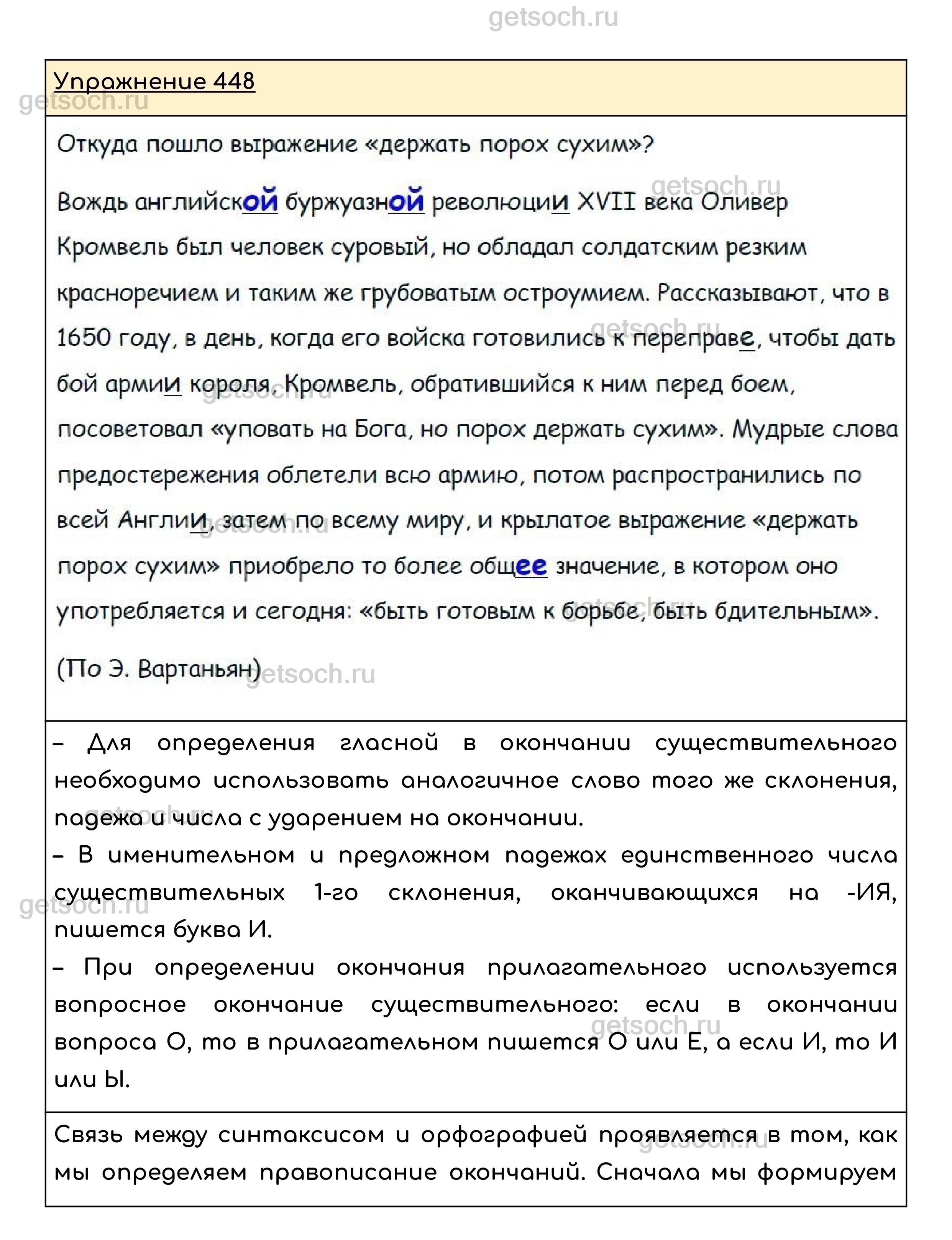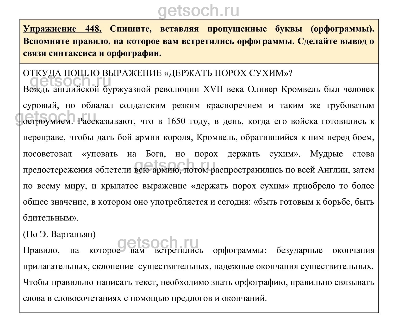 Упражнение 448. Спишите, вставляя пропущенные буквы (орфограммы). Вспомните правило, на которое вам встретились орфограммы. Сделайте вывод о связи синтаксиса и орфографии.