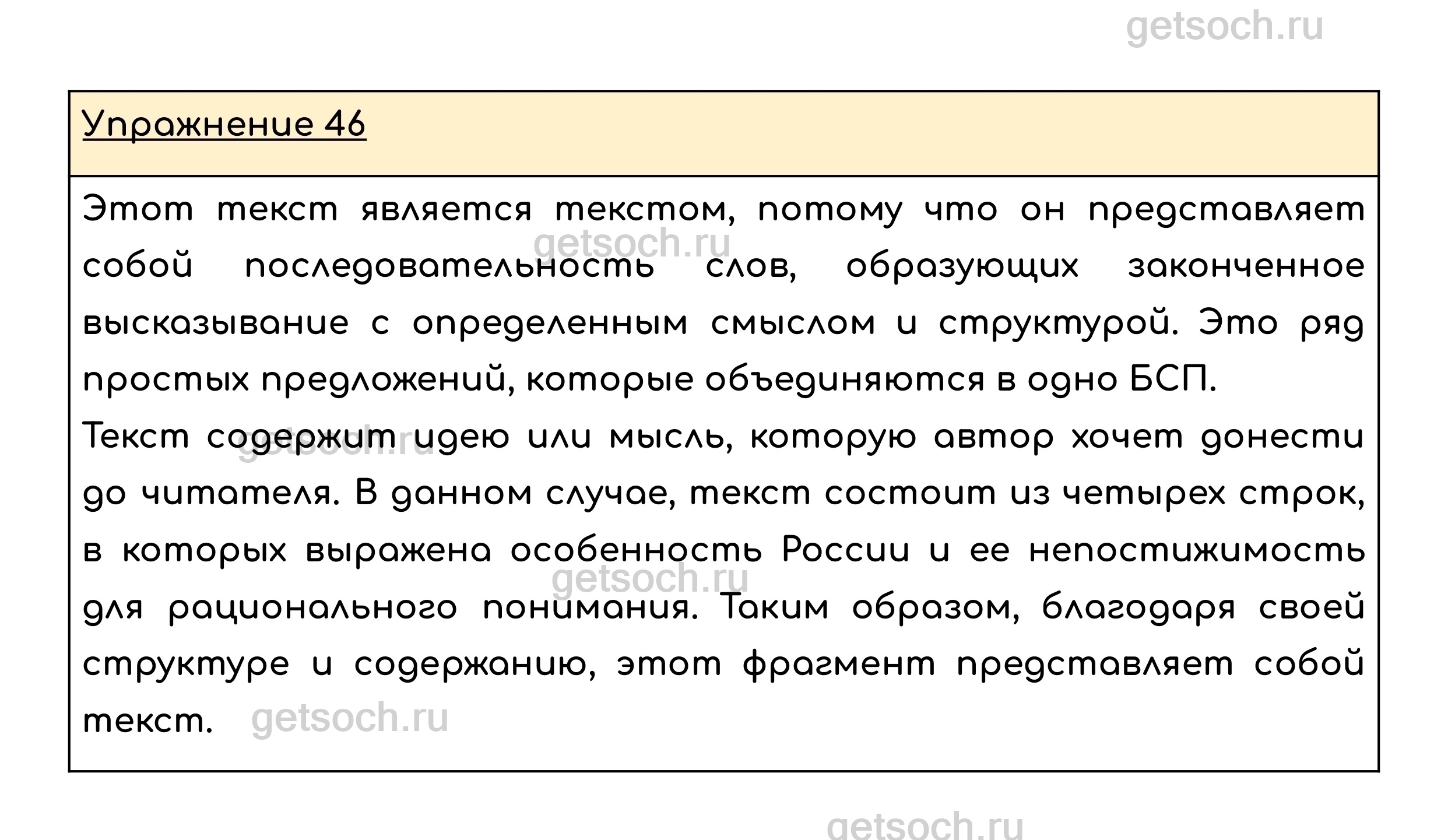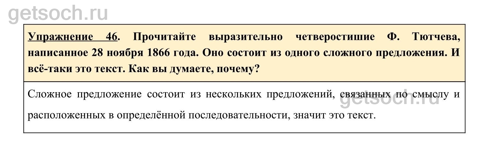 Упражнение 46. Прочитайте выразительно четверостишие Ф. Тютчева, написанное 28 ноября 1866 года. Оно состоит из одного сложного предложения. И всё-таки это текст. Как вы думаете, почему?