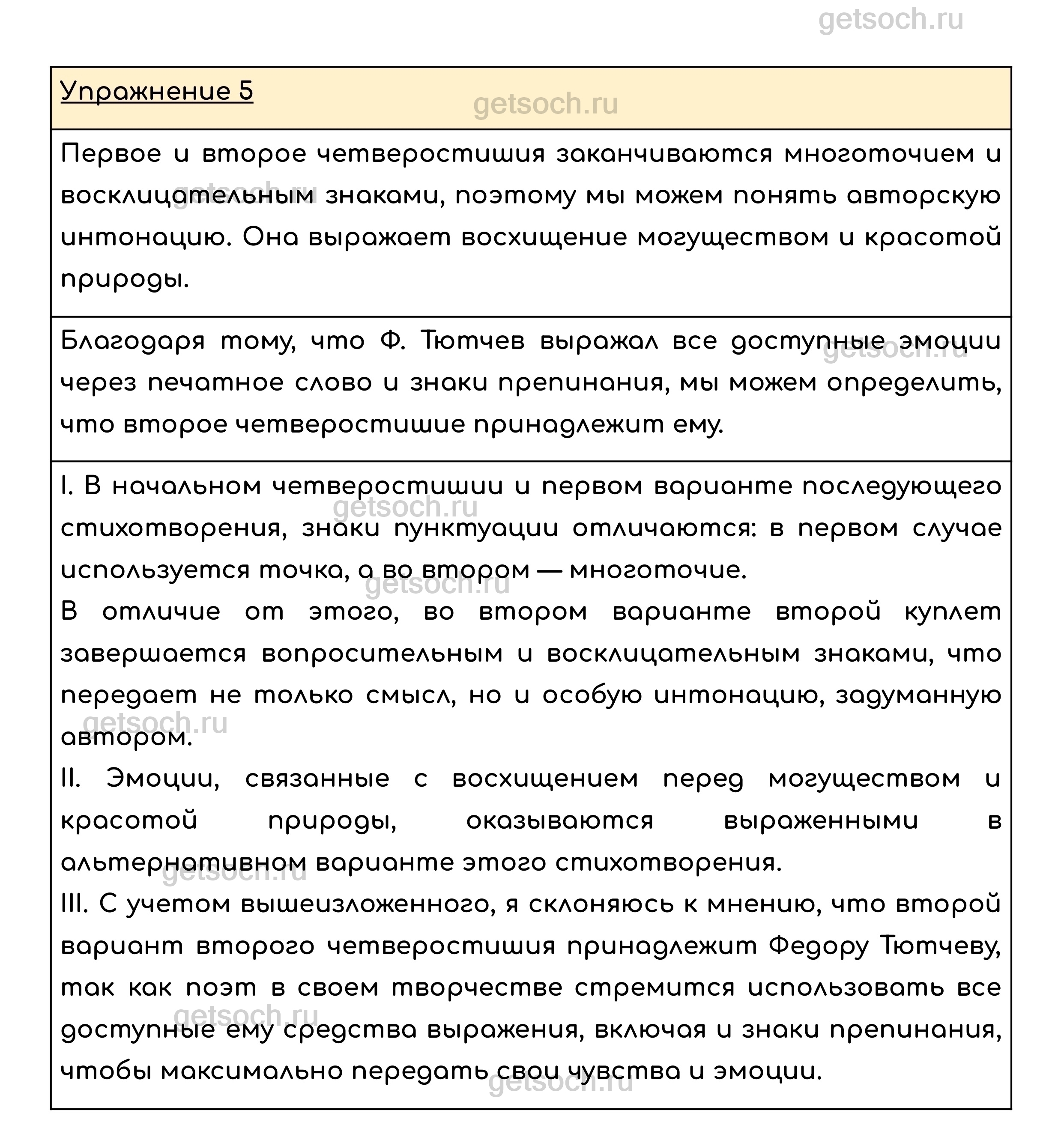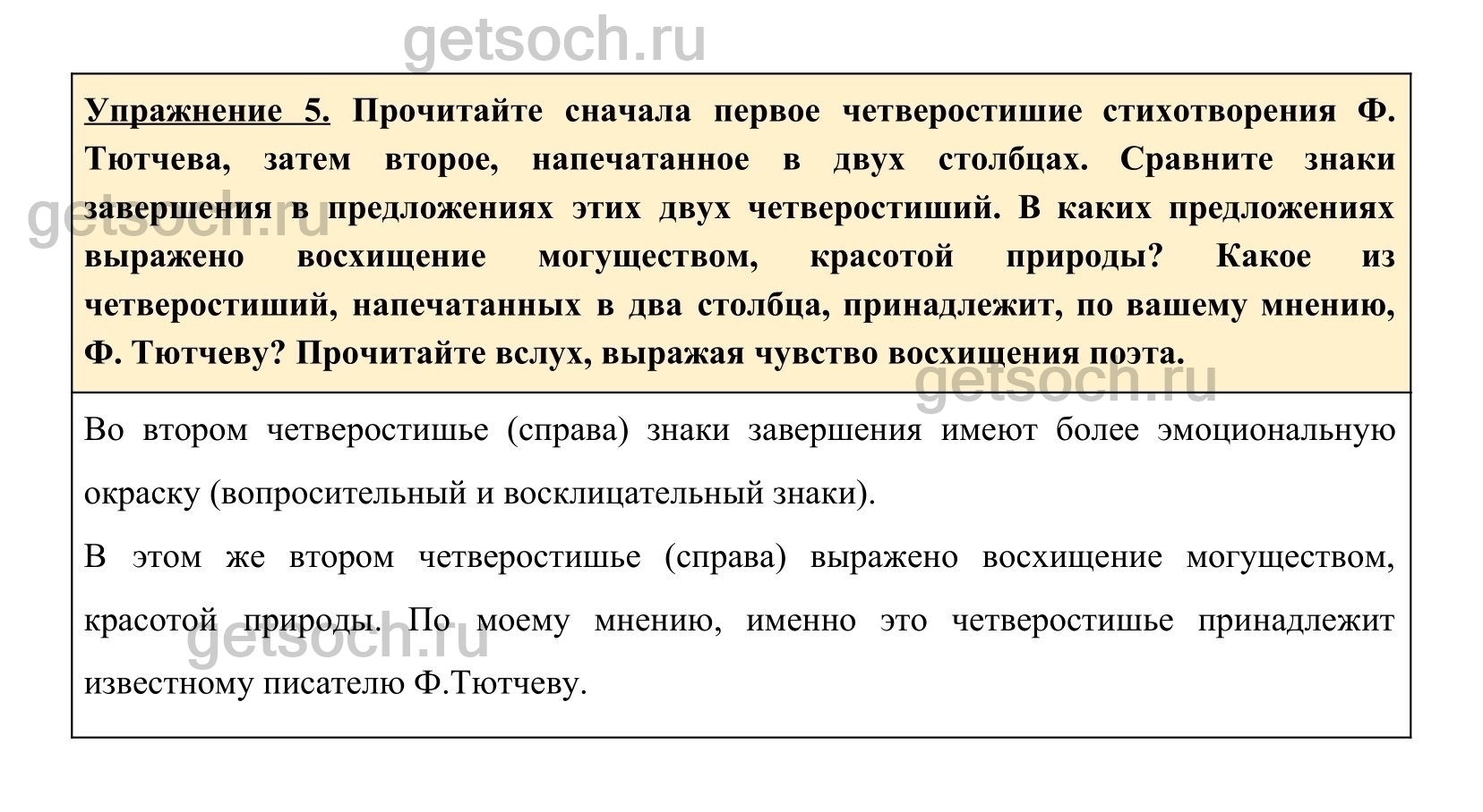 Упражнение 5. Прочитайте сначала первое четверостишие стихотворения Ф. Тютчева, затем второе, напечатанное в двух столбцах. Сравните знаки завершения в предложениях этих двух четверостиший. В каких предложениях выражено восхищение могуществом, красотой природы? Какое из четверостиший, напечатанных в два столбца, принадлежит, по вашему мнению, Ф. Тютчеву? Прочитайте вслух, выражая чувство восхищения поэта.