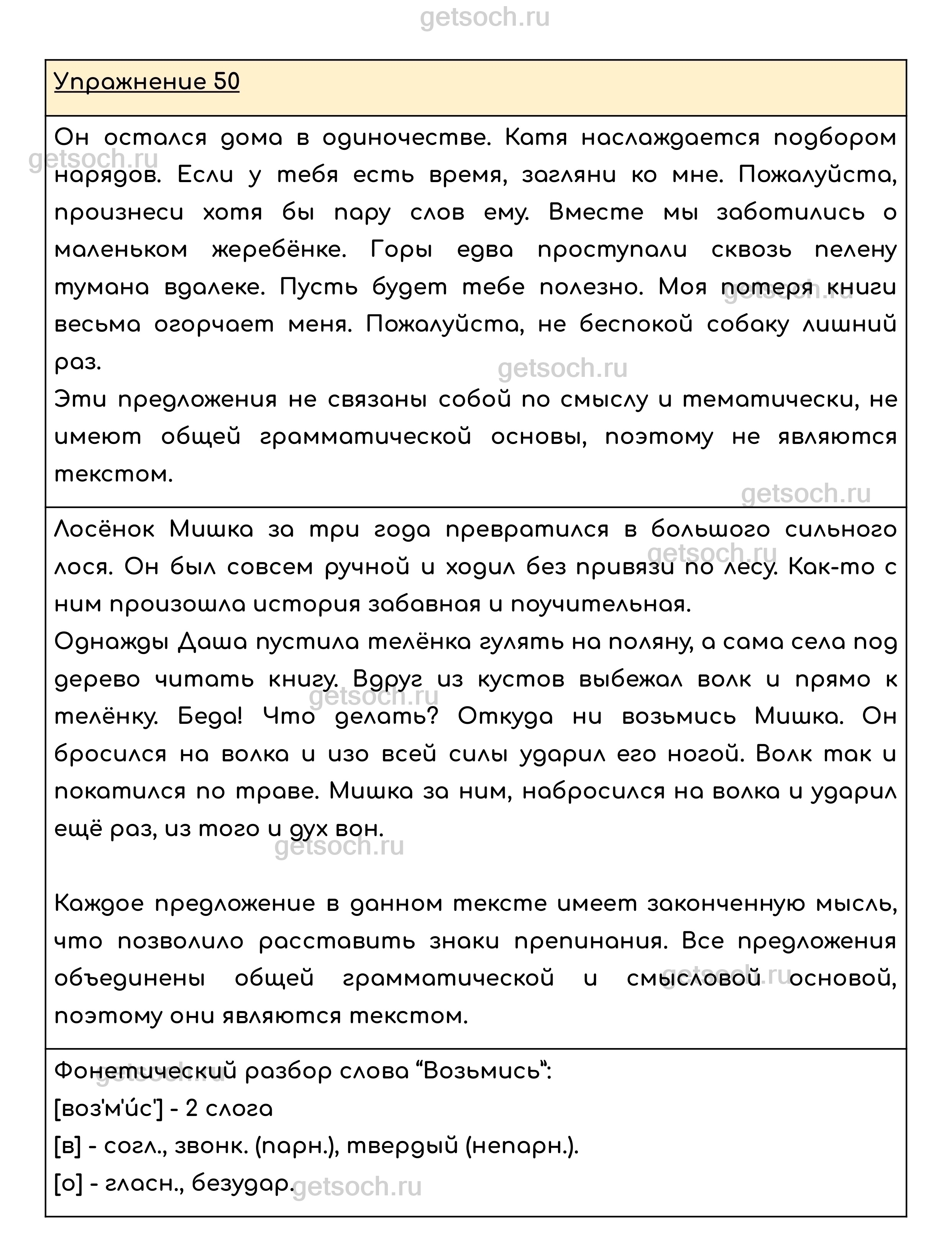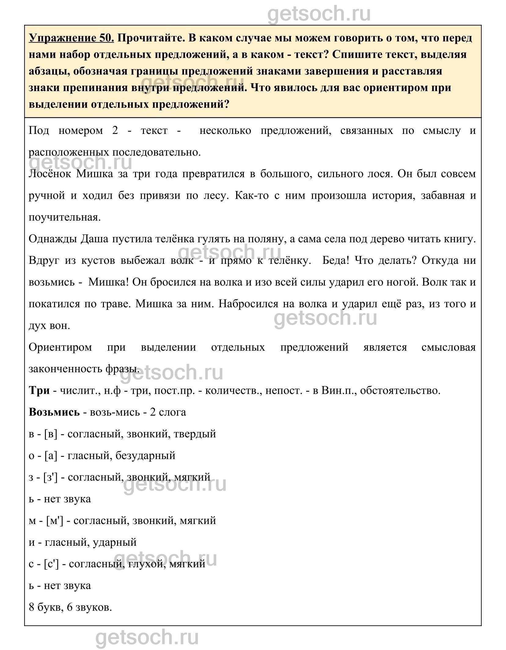 Упражнение 50. Прочитайте. В каком случае мы можем говорить о том, что перед нами набор отдельных предложений, а в каком – текст? Спишите текст, выделяя абзацы, обозначая границы предложений знаками завершения и расставляя знаки препинания внутри предложений. Что явилось для вас ориентиром при выделении отдельных предложений?