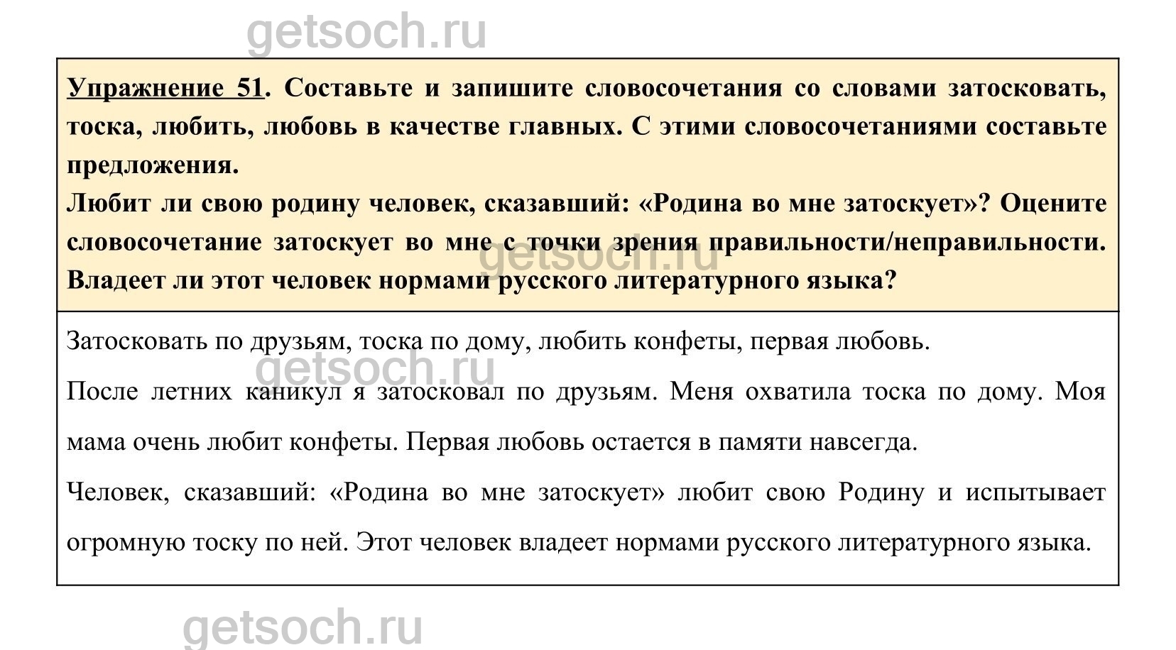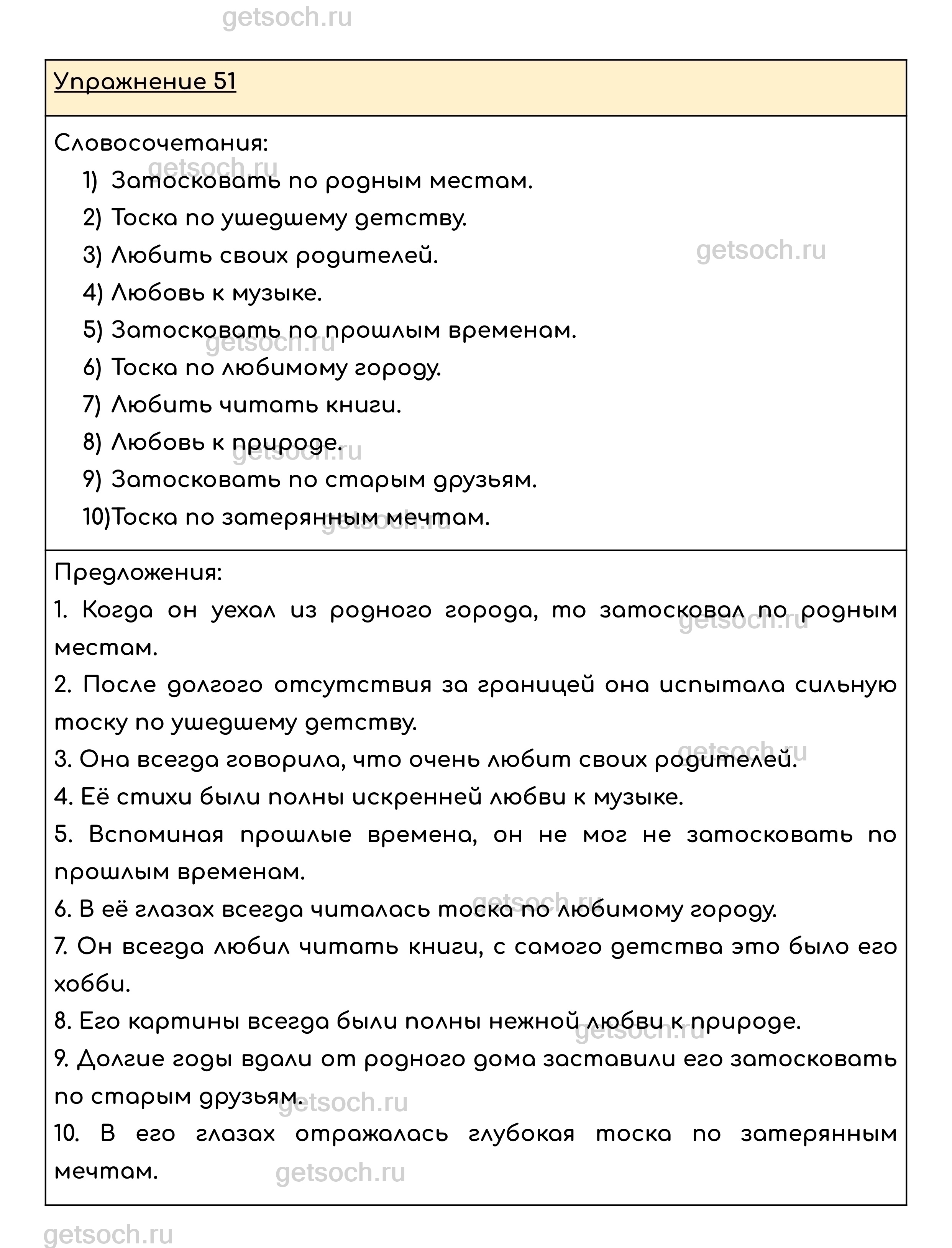 Упражнение 51. Составьте и запишите словосочетания со словами затосковать, тоска, любить, любовь в качестве главных. С этими словосочетаниями составьте предложения.