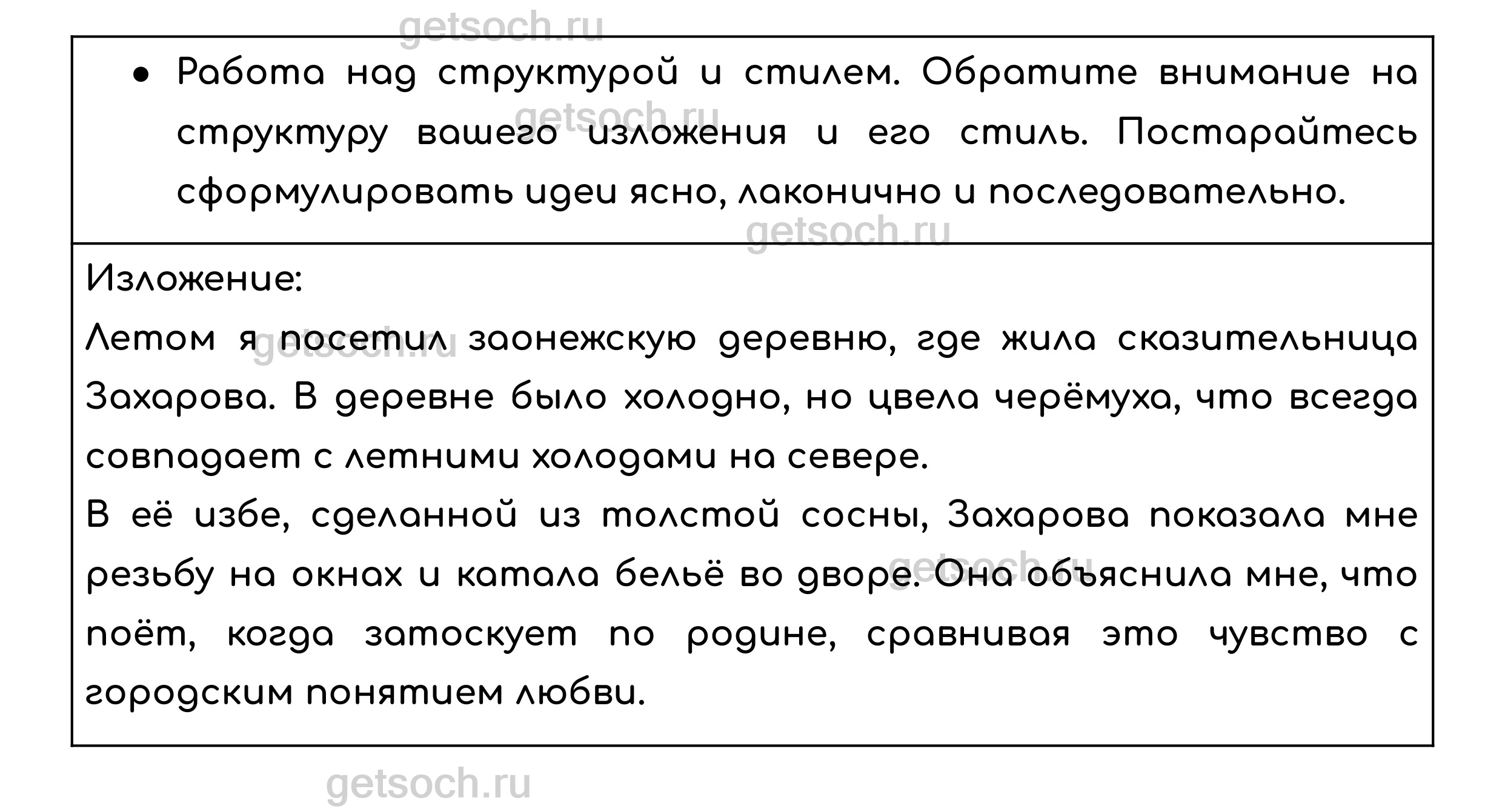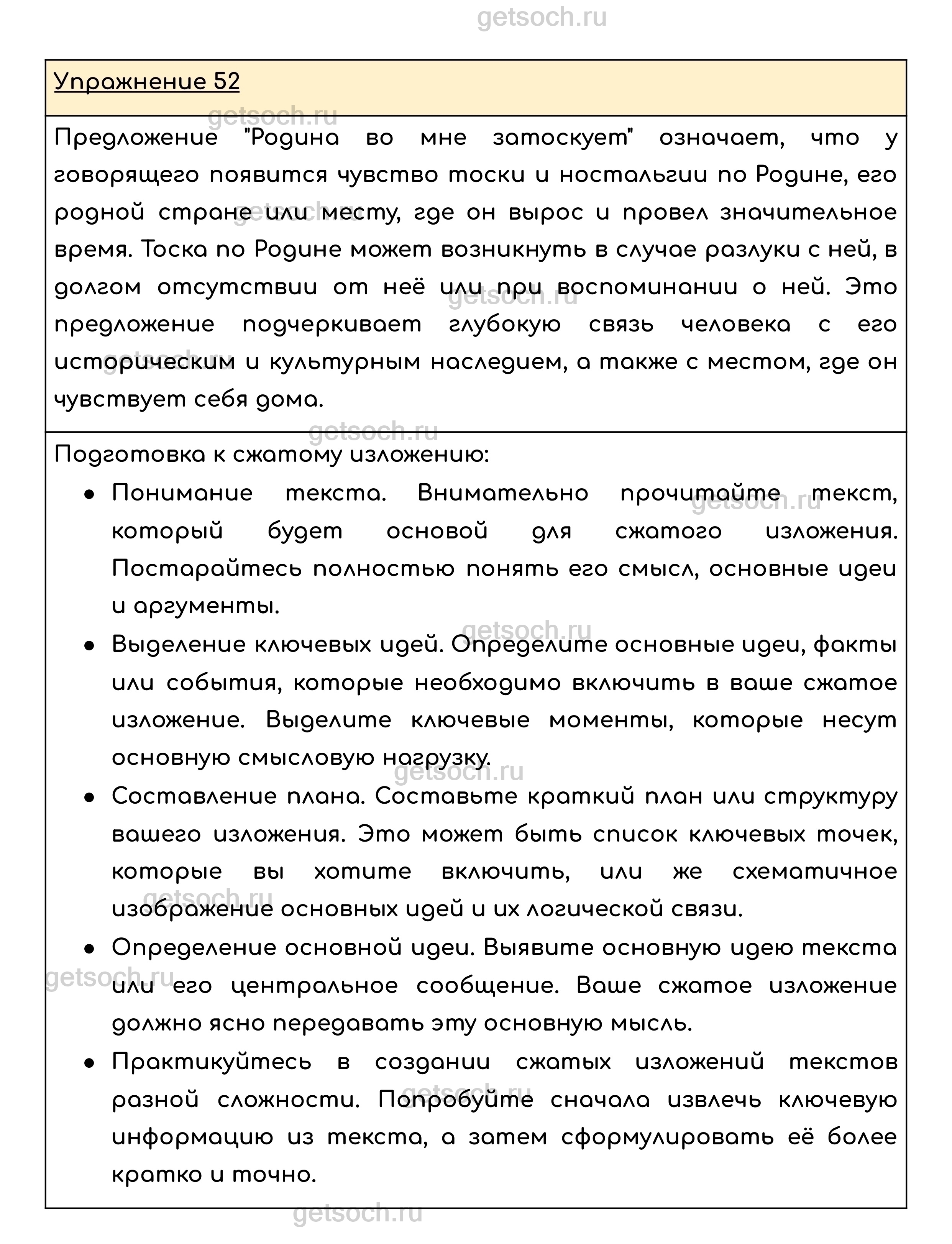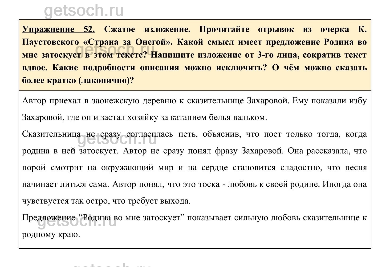 Упражнение 52. Сжатое изложение. Прочитайте отрывок из очерка К. Паустовского «Страна за Онегой». Какой смысл имеет предложение Родина во мне затоскует в этом тексте? Напишите изложение от 3-го лица, сократив текст вдвое. Какие подробности описания можно исключить? О чём можно сказать более кратко (лаконично)?