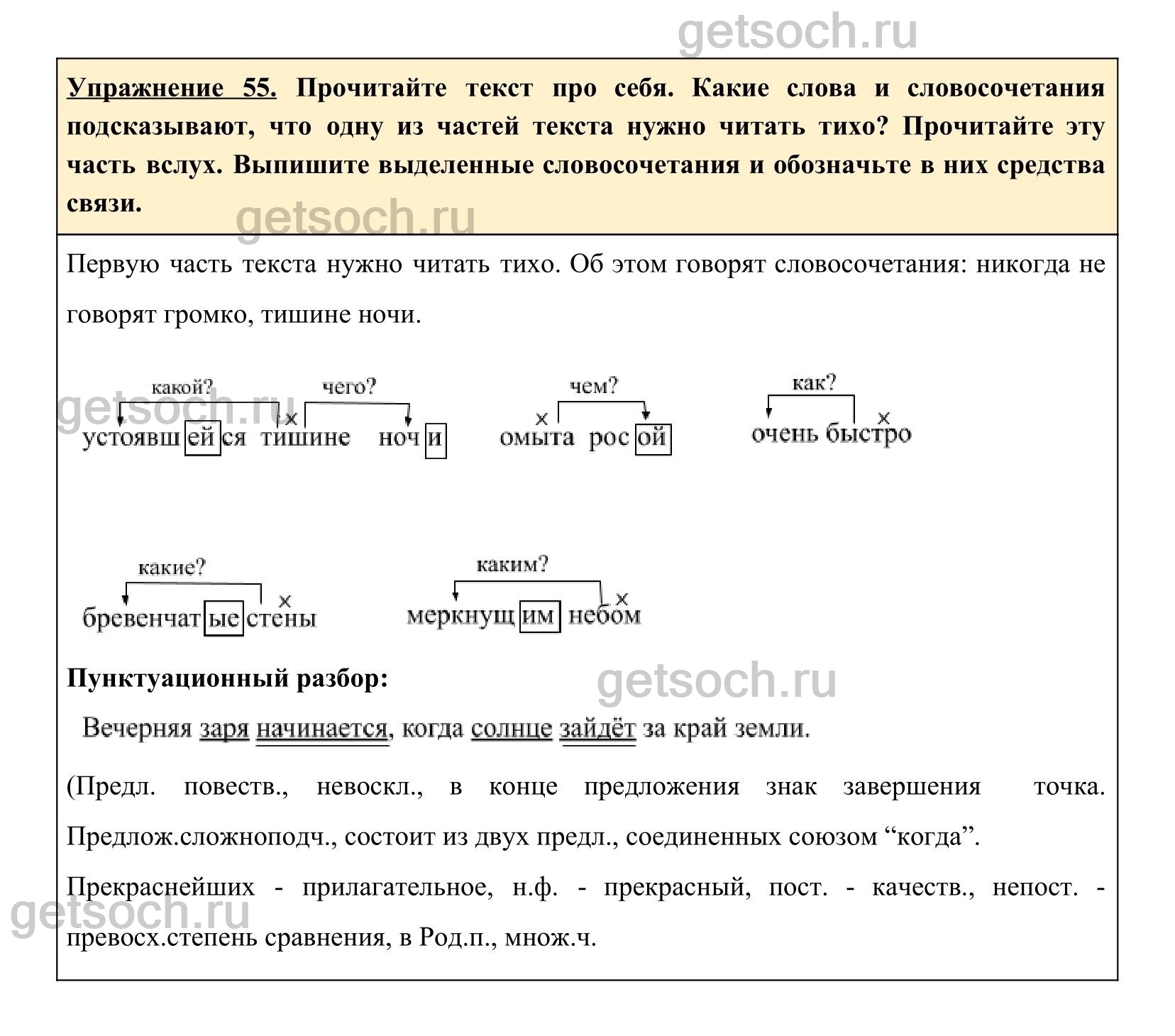 Упражнение 55. Прочитайте текст про себя. Какие слова и словосочетания подсказывают, что одну из частей текста нужно читать тихо? Прочитайте эту часть вслух. Выпишите выделенные словосочетания и обозначьте в них средства связи.