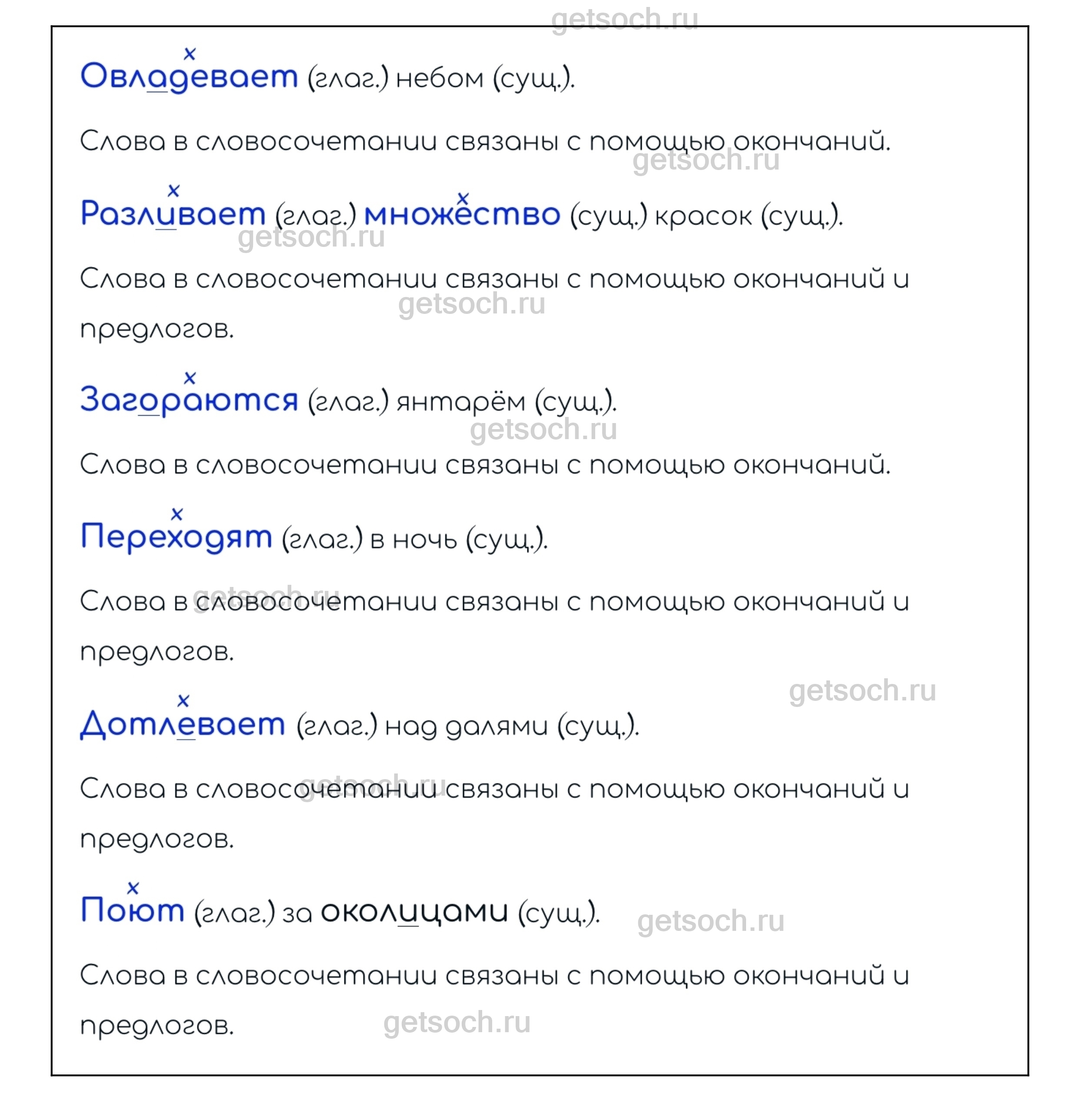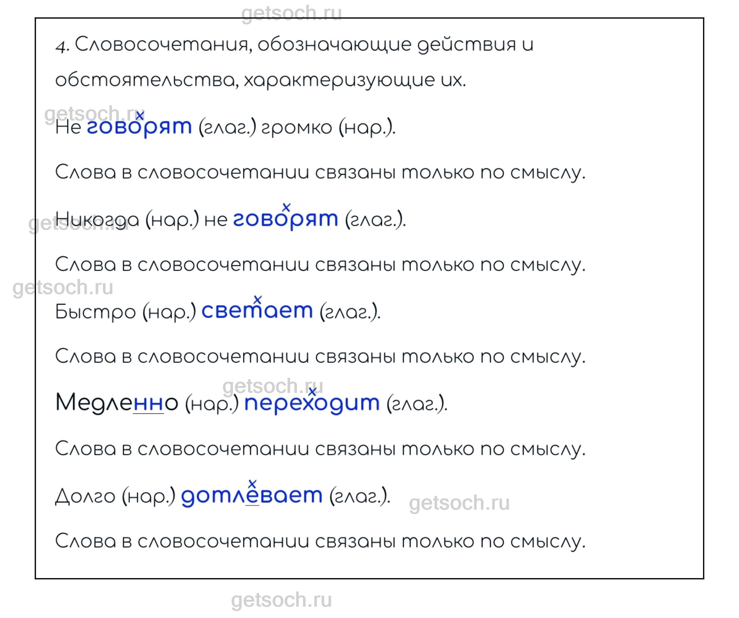 Упражнение 58. Распределите словосочетания на группы: называющие предмет (явление) и его признак; называющие признак действия и степень его проявления; обозначающие действия и предметы (явления), по отношению к которым осуществляется действие; действия и обстоятельства, характеризующие их. Графически обозначьте связь слов в словосочетаниях; определите, какими частями речи являются главное и зависимое слово. С помощью каких средств осуществляется связь слов в этих словосочетаниях?