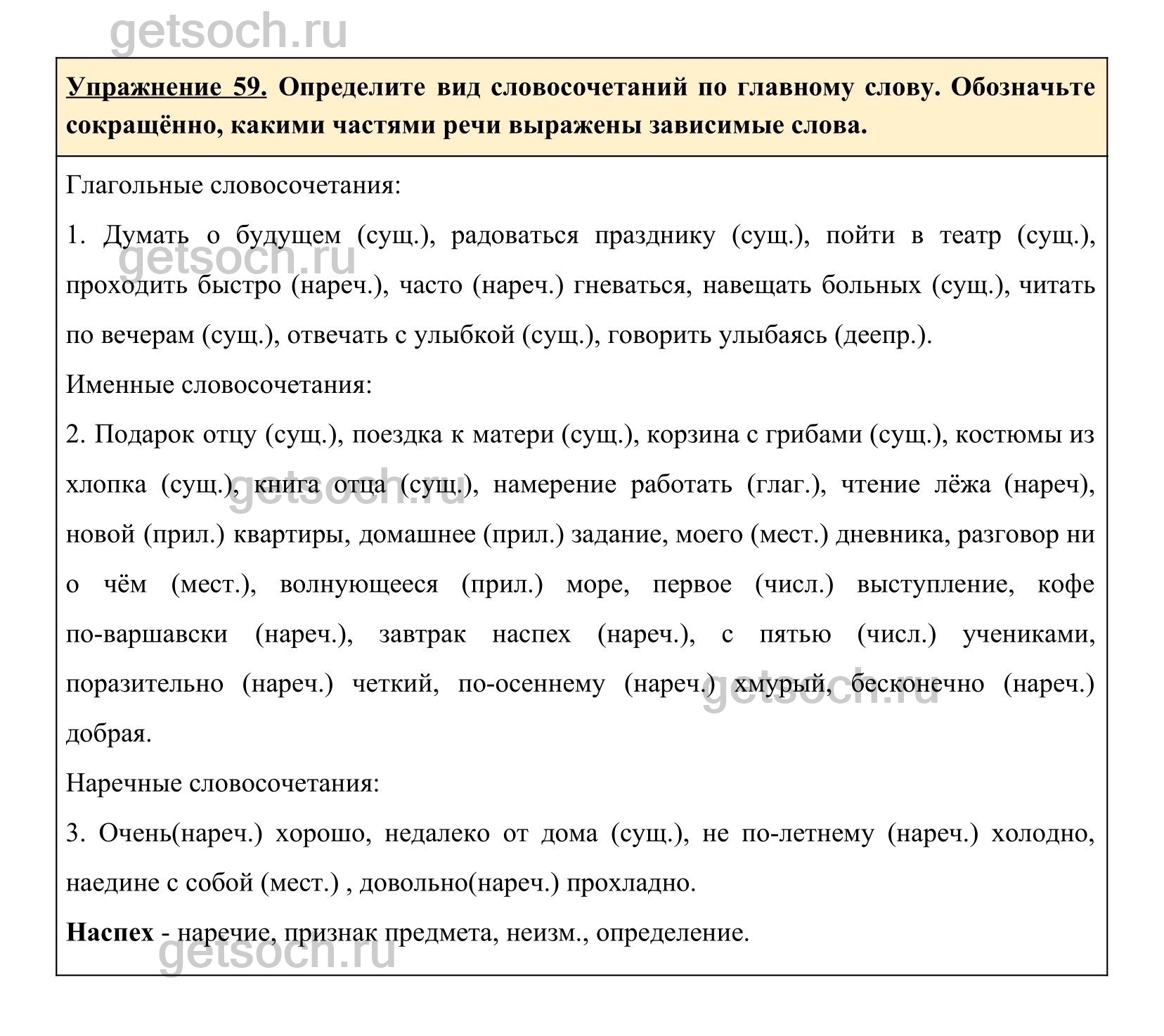Упражнение 59. Определите вид словосочетаний по главному слову. Обозначьте сокращённо, какими частями речи выражены зависимые слова.