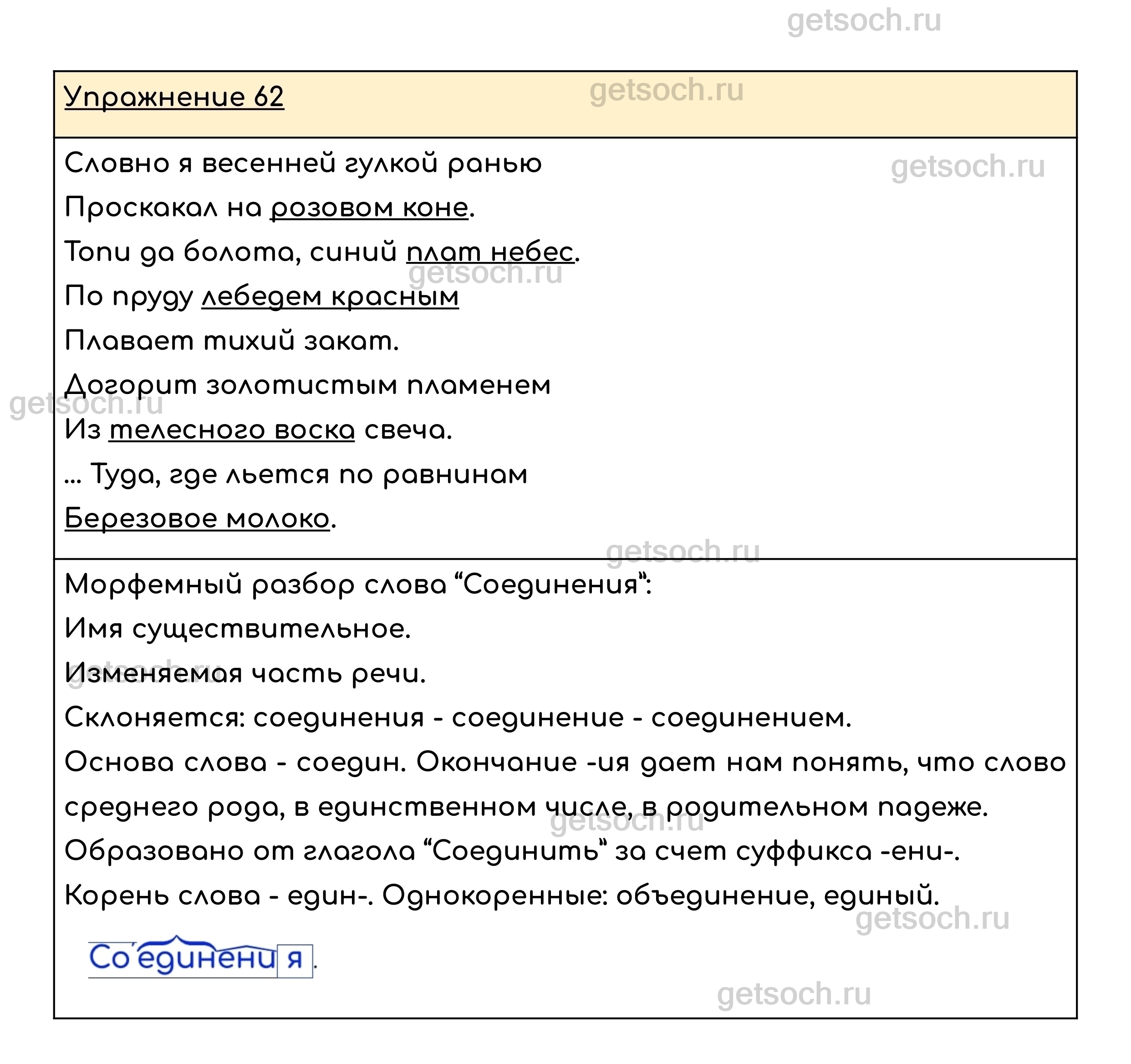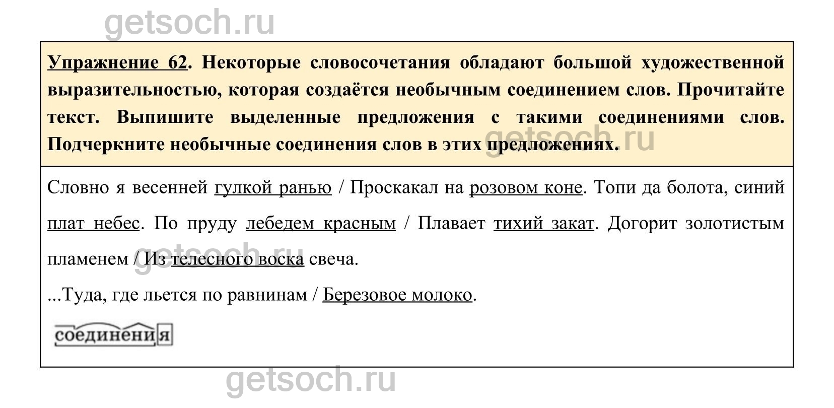 Упражнение 62. Некоторые словосочетания обладают большой художественной выразительностью, которая создаётся необычным соединением слов. Прочитайте текст. Выпишите выделенные предложения с такими соединениями слов. Подчеркните необычные соединения слов в этих предложениях.