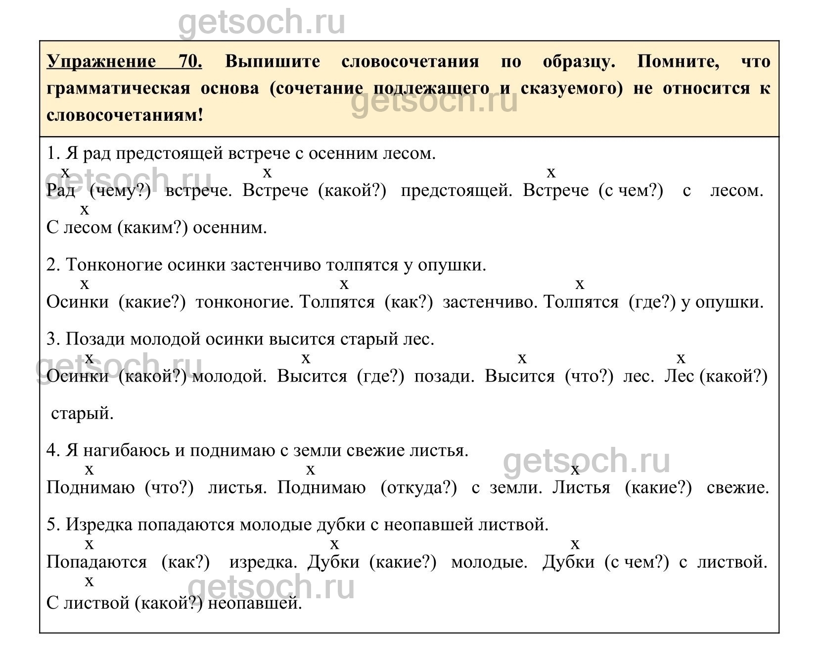 Упражнение 70. Выпишите словосочетания по образцу. Помните, что грамматическая основа (сочетание подлежащего и сказуемого) не относится к словосочетаниям!