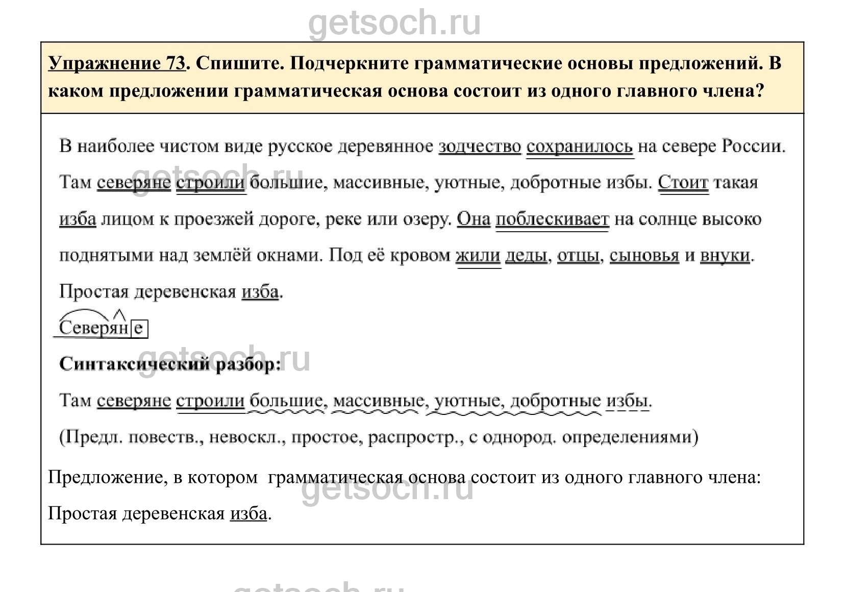 Упражнение 73. Спишите. Подчеркните грамматические основы предложений. В каком предложении грамматическая основа состоит из одного главного члена?
