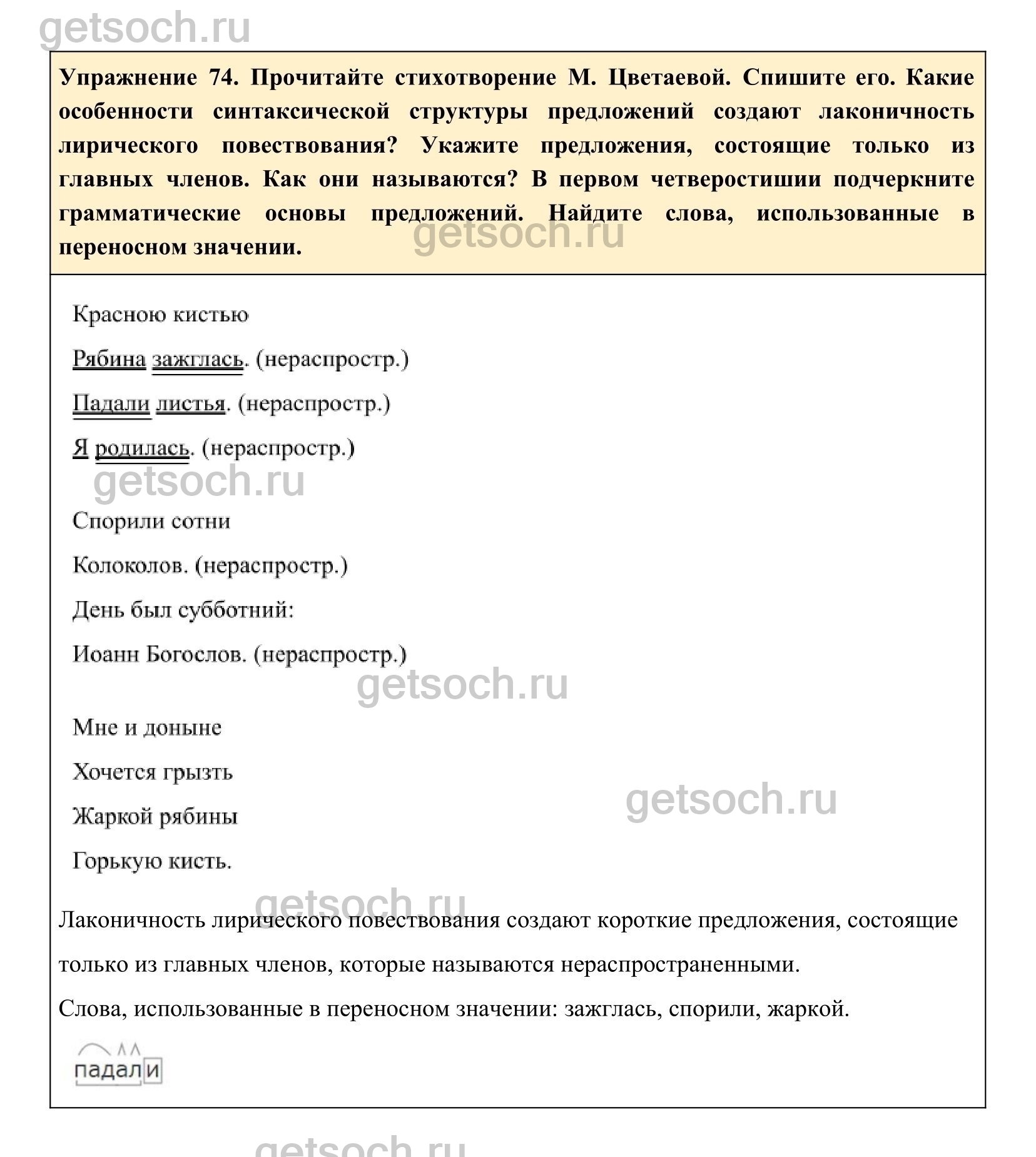 Упражнение 74. Прочитайте стихотворение М. Цветаевой. Спишите его. Какие особенности синтаксической структуры предложений создают лаконичность лирического повествования? Укажите предложения, состоящие только из главных членов. Как они называются? В первом четверостишии подчеркните грамматические основы предложений. Найдите слова, использованные в переносном значении.
