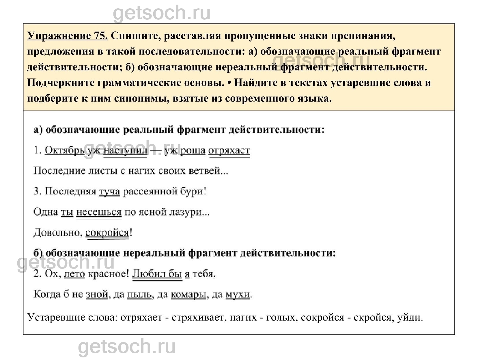 Упражнение 75. Спишите, расставляя пропущенные знаки препинания, предложения в такой последовательности: а) обозначающие реальный фрагмент действительности; б) обозначающие нереальный фрагмент действительности. Подчеркните грамматические основы. • Найдите в текстах устаревшие слова и подберите к ним синонимы, взятые из современного языка.