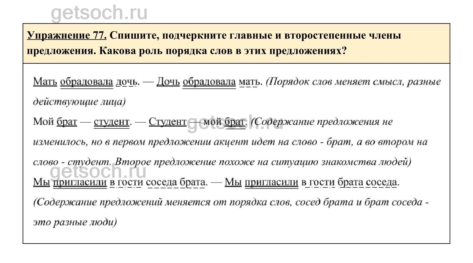 Упражнение 77. Спишите, подчеркните главные и второстепенные члены предложения. Какова роль порядка слов в этих предложениях?