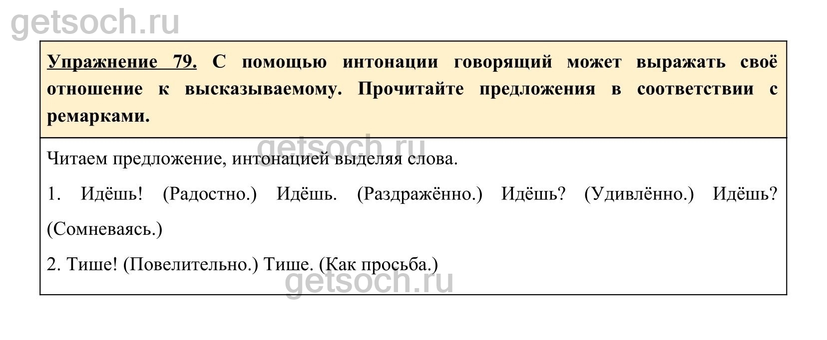 Упражнение 79. С помощью интонации говорящий может выражать своё отношение к высказываемому. Прочитайте предложения в соответствии с ремарками.
