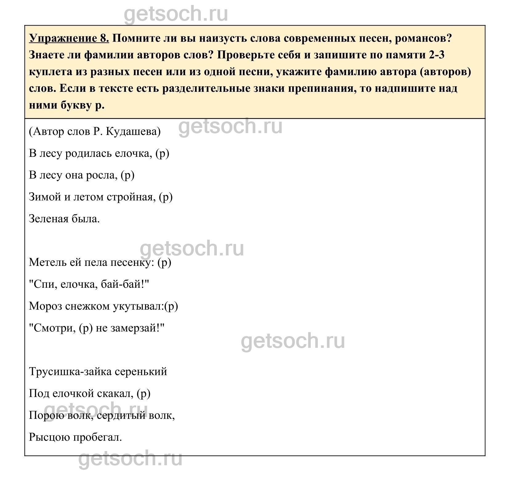 Упражнение 8. Помните ли вы наизусть слова современных песен, романсов? Знаете ли фамилии авторов слов? Проверьте себя и запишите по памяти 2-3 куплета из разных песен или из одной песни, укажите фамилию автора (авторов) слов. Если в тексте есть разделительные знаки препинания, то надпишите над ними букву р.