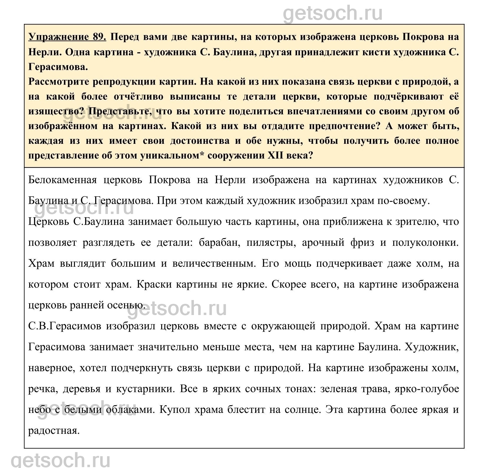 Упражнение 89. Перед вами две картины, на которых изображена церковь Покрова на Нерли. Одна картина – художника страница Баулина, другая принадлежит кисти художника страница Герасимова.