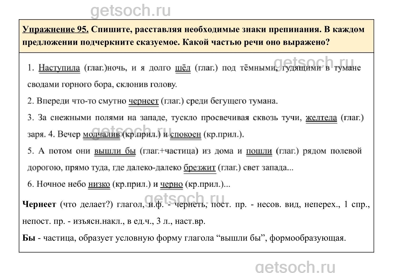 Упражнение 95. Спишите, расставляя необходимые знаки препинания. В каждом предложении подчеркните сказуемое. Какой частью речи оно выражено?