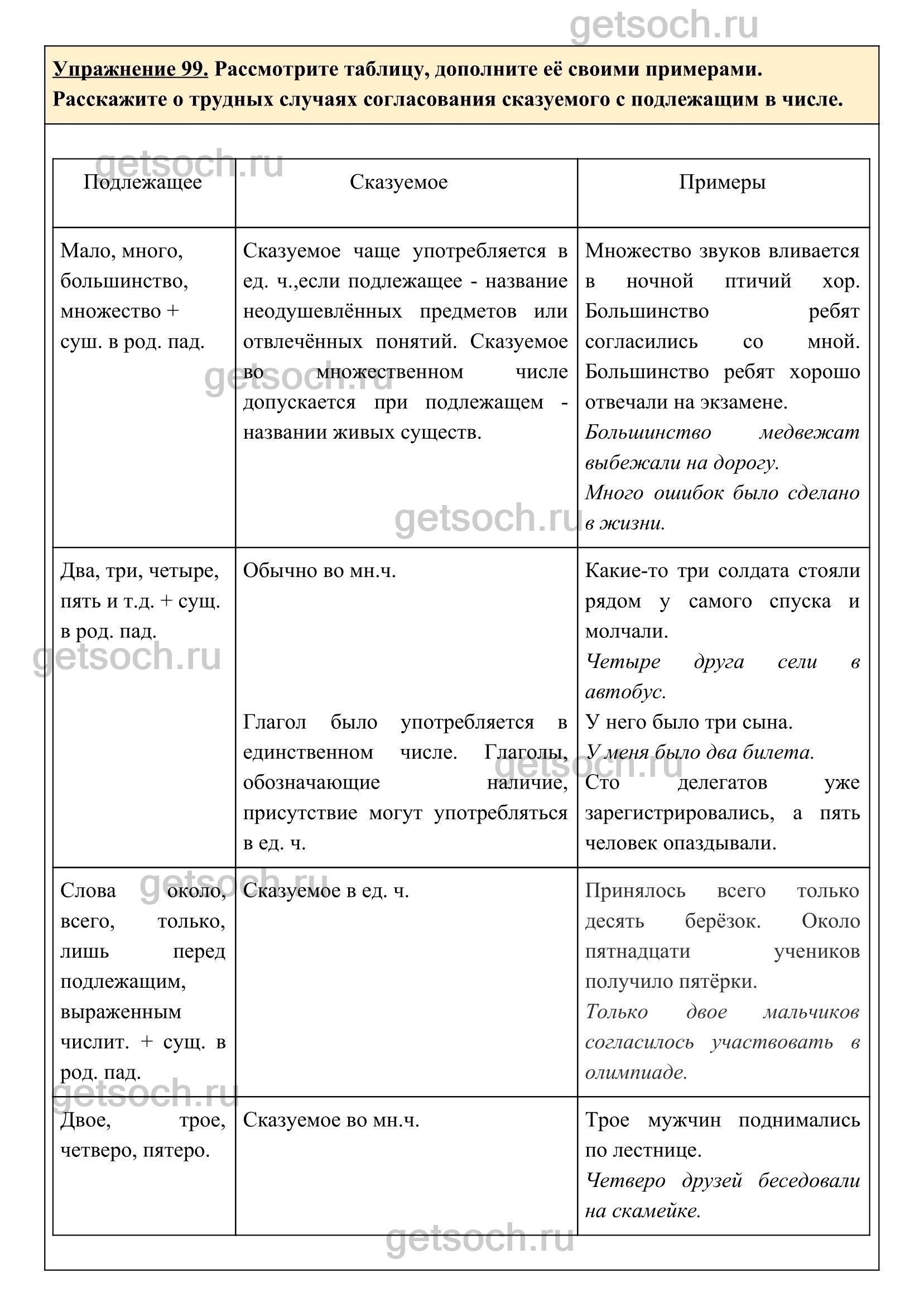 Упражнение 99. Рассмотрите таблицу, дополните её своими примерами. Расскажите о трудных случаях согласования сказуемого с подлежащим в числе.