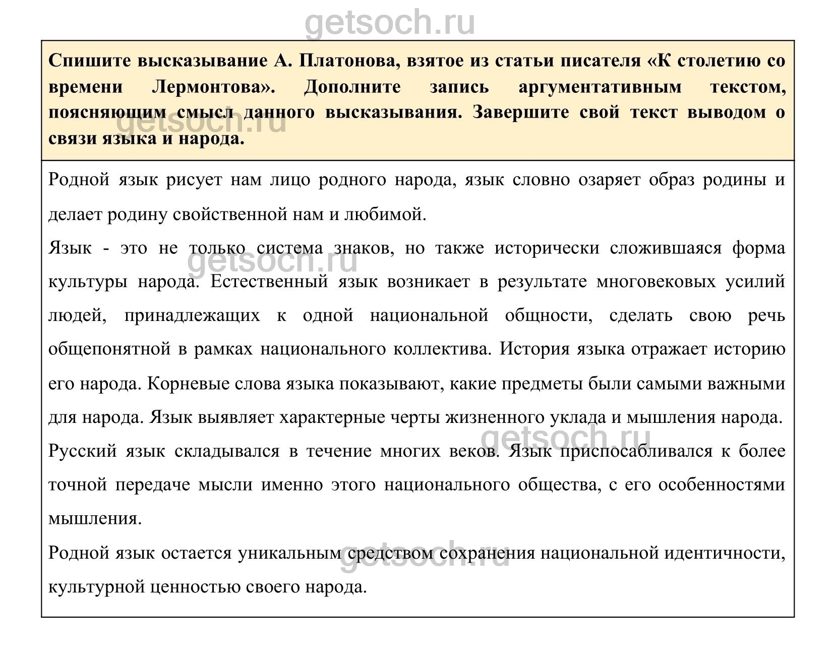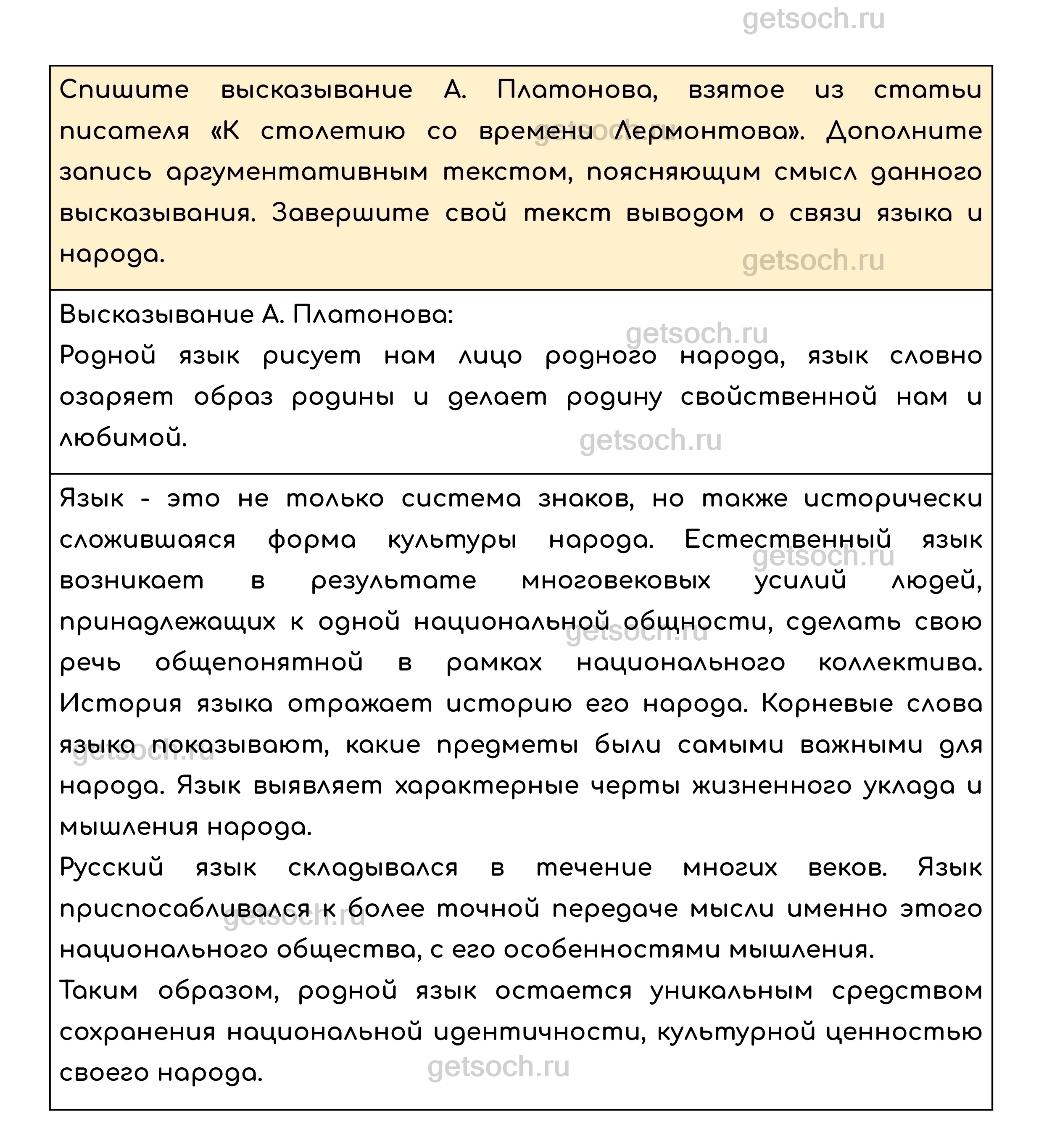 Спишите высказывание А. Платонова, взятое из статьи писателя «К столетию со времени Лермонтова». Дополните запись аргументативным текстом, поясняющим смысл данного высказывания. Завершите свой текст выводом о связи языка и народа.