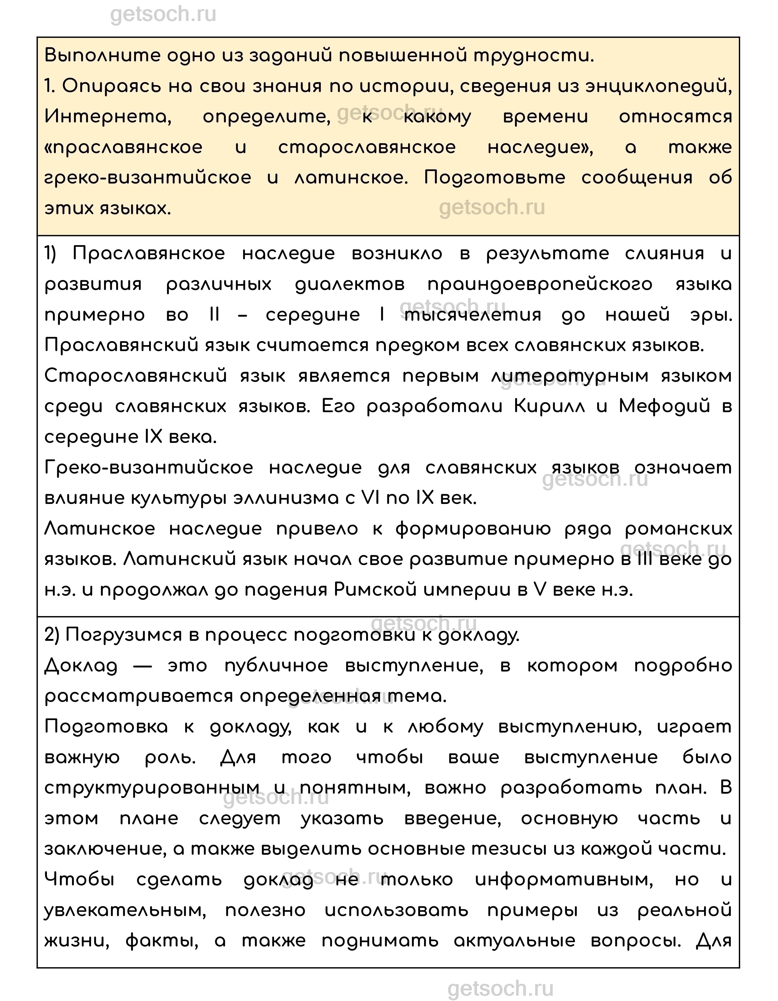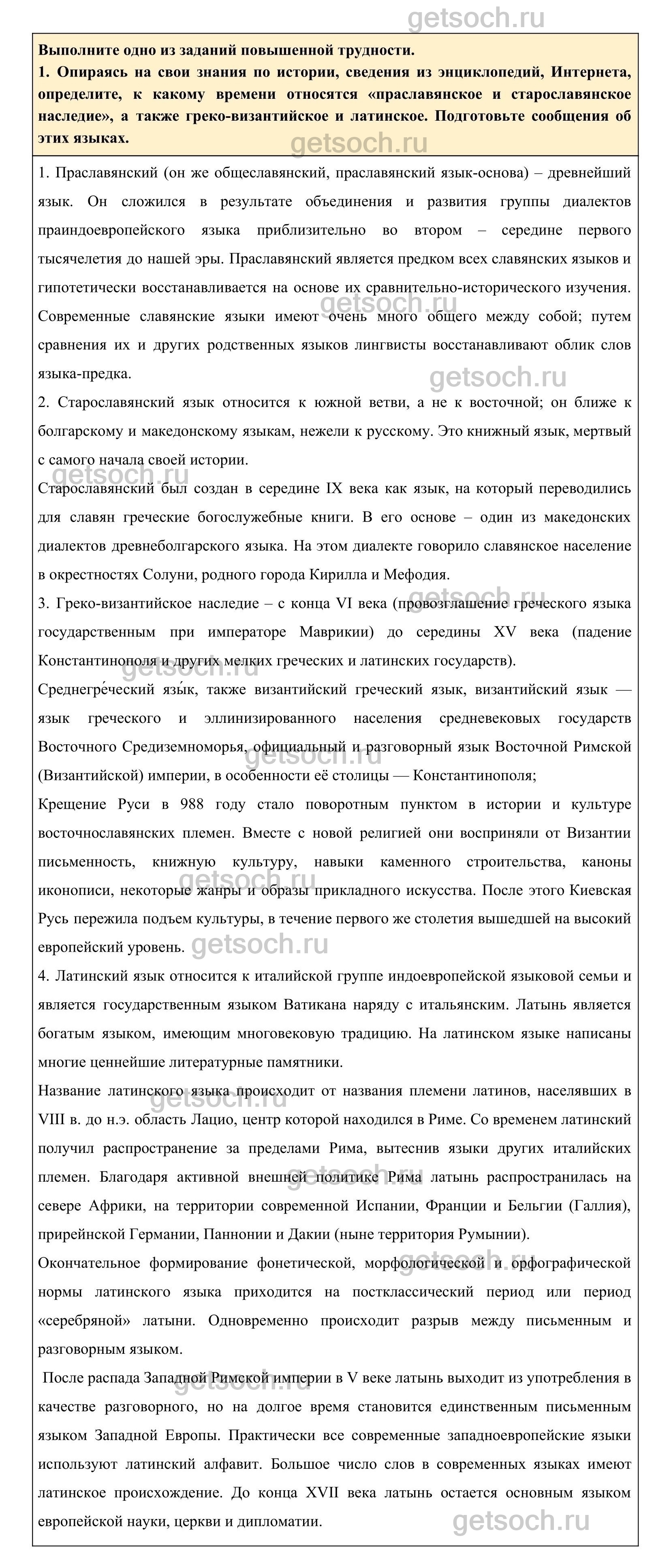 1. Опираясь на свои знания по истории, сведения из энциклопедий, Интернета, определите, к какому времени относятся «праславянское и старославянское наследие», а также греко-византийское и латинское. Подготовьте сообщения об этих языках.