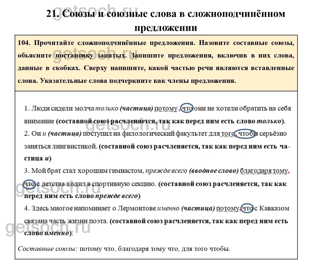 104. Прочитайте сложноподчинённые предложения. Назовите составные союзы, объясните постановку запятых. Запишите предложения, включив в них слова, данные в скобках. Сверху напишите, какой частью речи являются вставленные слова. Указательные слова подчеркните как члены предложения.
