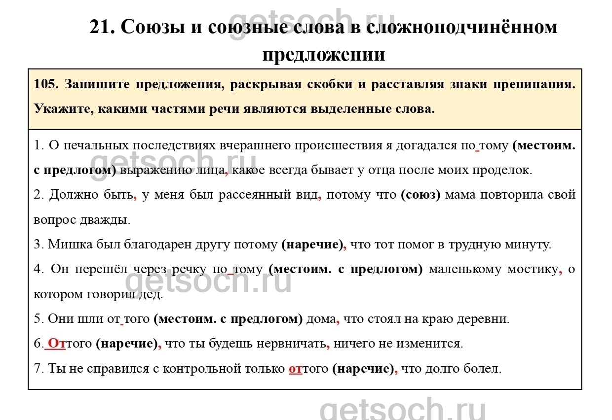 105. Запишите предложения, раскрывая скобки и расставляя знаки препинания. Укажите, какими частями речи являются выделенные слова.