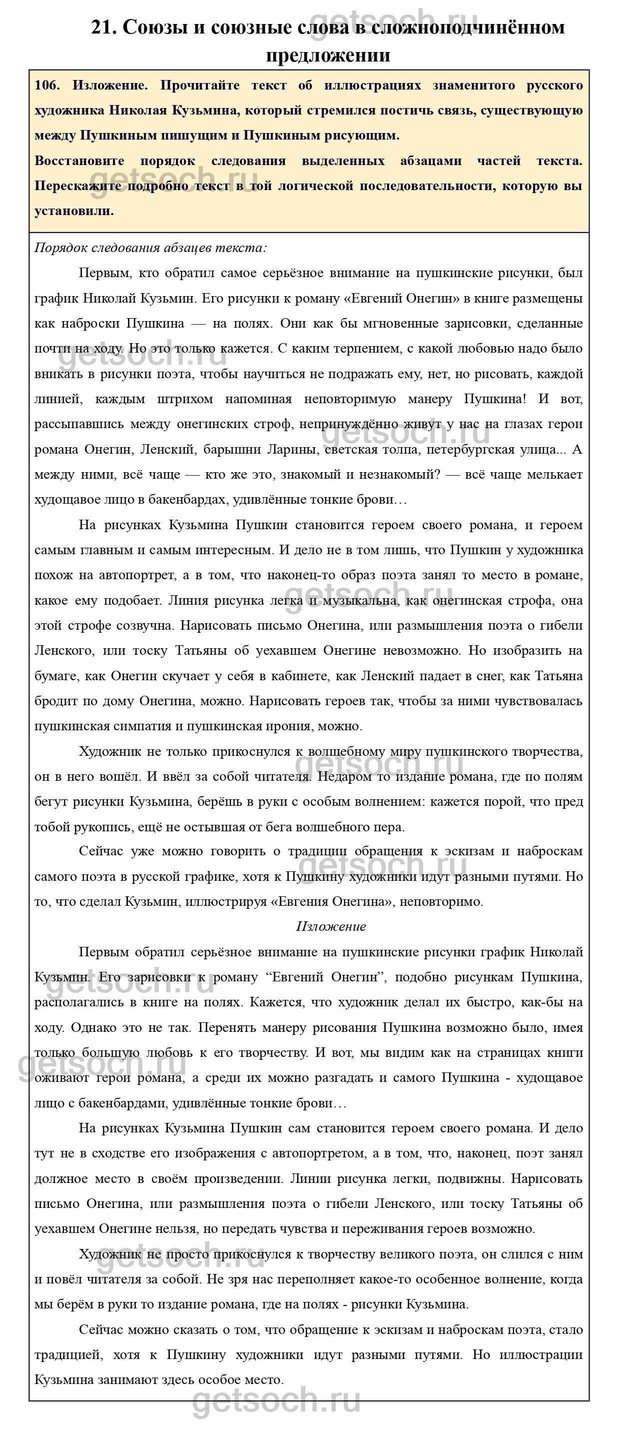 106. Изложение. Прочитайте текст об иллюстрациях знаменитого русского художника Николая Кузьмина, который стремился постичь связь, существующую между Пушкиным пишущим и Пушкиным рисующим.