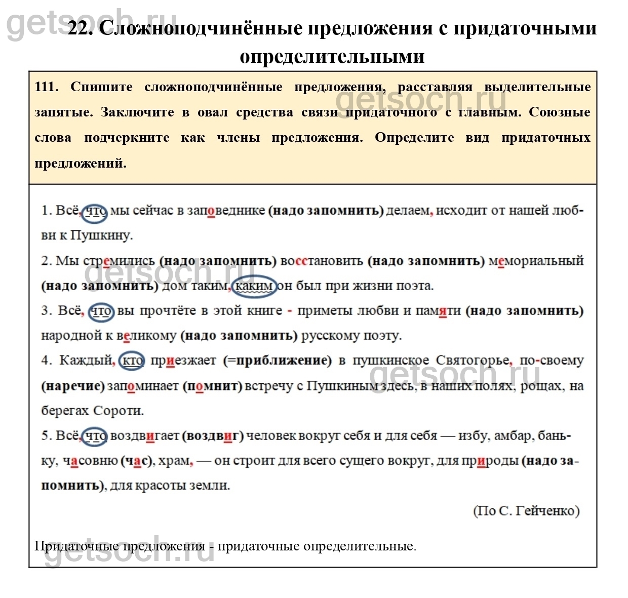111. Спишите сложноподчинённые предложения, расставляя выделительные запятые. Заключите в овал средства связи придаточного с главным. Союзные слова подчеркните как члены предложения. Определите вид придаточных предложений.