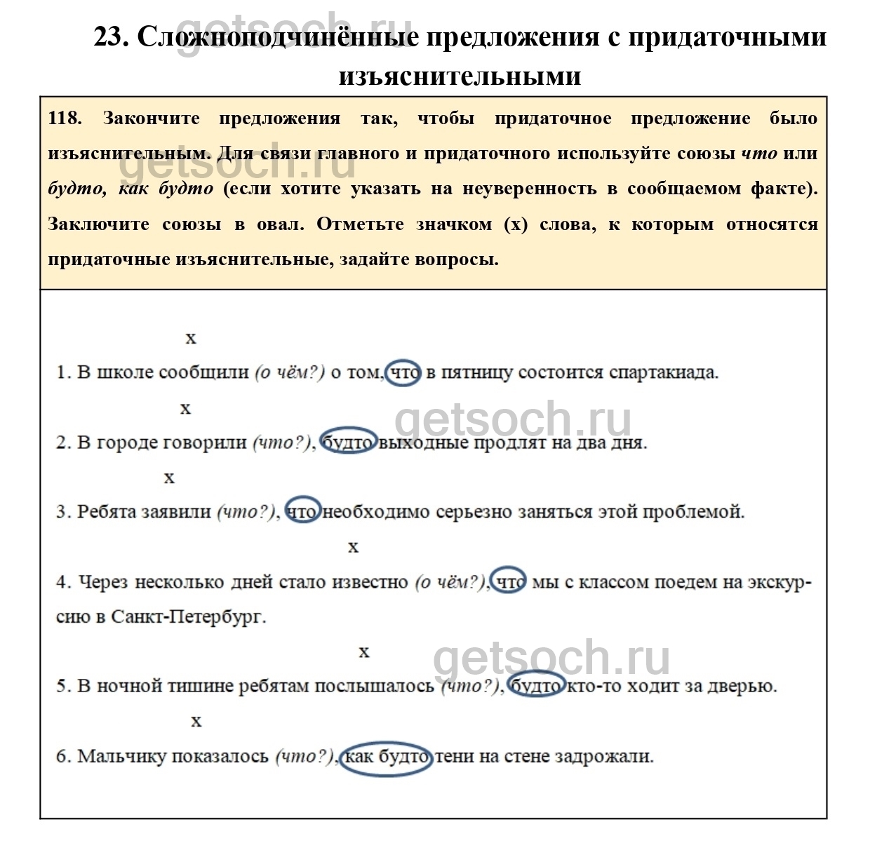 118. Закончите предложения так, чтобы придаточное предложение было изъяснительным. Для связи главного и придаточного используйте союзы что или будто, как будто (если хотите указать на неуверенность в сообщаемом факте). Заключите союзы в овал. Отметьте значком (х) слова, к которым относятся придаточные изъяснительные, задайте вопросы.