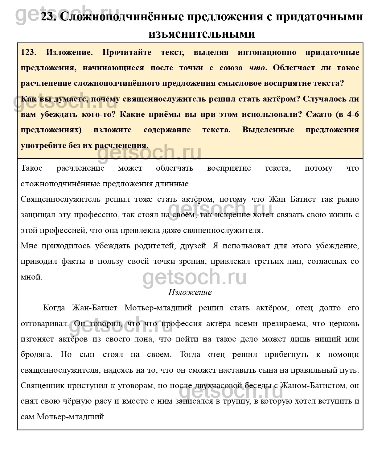 123. Изложение. Прочитайте текст, выделяя интонационно придаточные предложения, начинающиеся после точки с союза что. Облегчает ли такое расчленение сложноподчинённого предложения смысловое восприятие текста?