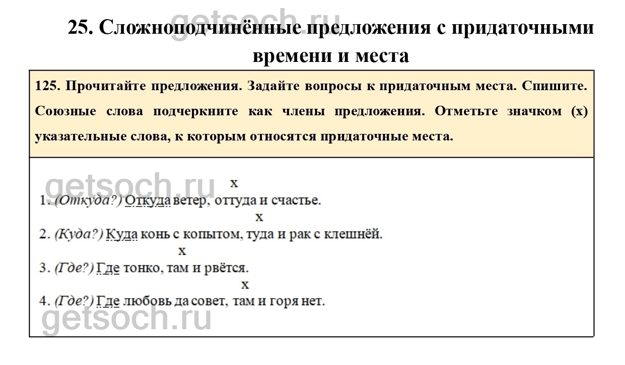 125. Прочитайте предложения. Задайте вопросы к придаточным места. Спишите. Союзные слова подчеркните как члены предложения. Отметьте значком (х) указательные слова, к которым относятся придаточные места.