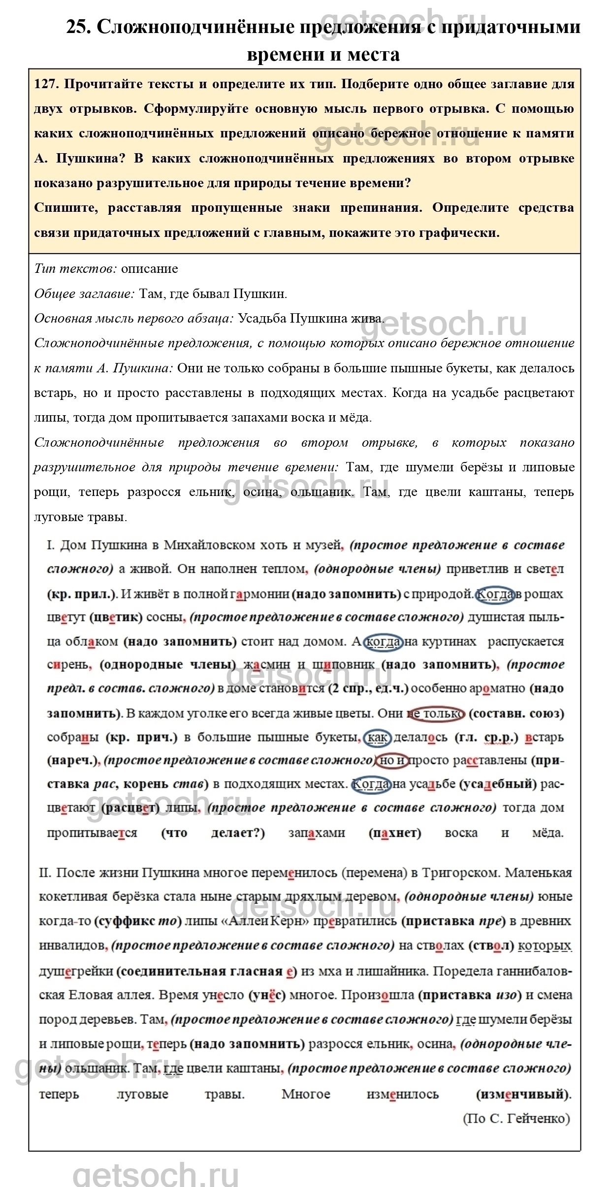 127. Прочитайте тексты и определите их тип. Подберите одно общее заглавие для двух отрывков. Сформулируйте основную мысль первого отрывка. С помощью каких сложноподчинённых предложений описано бережное отношение к памяти А. Пушкина? В каких сложноподчинённых предложениях во втором отрывке показано разрушительное для природы течение времени?