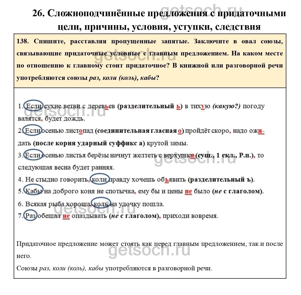 138. Спишите, расставляя пропущенные запятые. Заключите в овал союзы, связывающие придаточные условные с главным предложением. На каком месте по отношению к главному стоит придаточное? В книжной или разговорной речи употребляются союзы раз, коли (коль), кабы?
