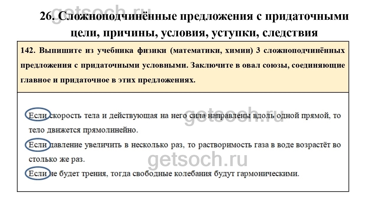 142. Выпишите из учебника физики (математики, химии) 3 сложноподчинённых предложения с придаточными условными. Заключите в овал союзы, соединяющие главное и придаточное в этих предложениях.