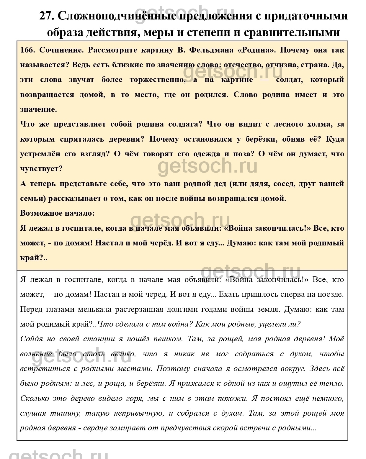 166. Сочинение. Рассмотрите картину В. Фельдмана «Родина». Почему она так называется? Ведь есть близкие по значению слова: отечество, отчизна, страна. Да, эти слова звучат более торжественно, а на картине — солдат, который возвращается домой, в то место, где он родился. Слово родина имеет и это значение.