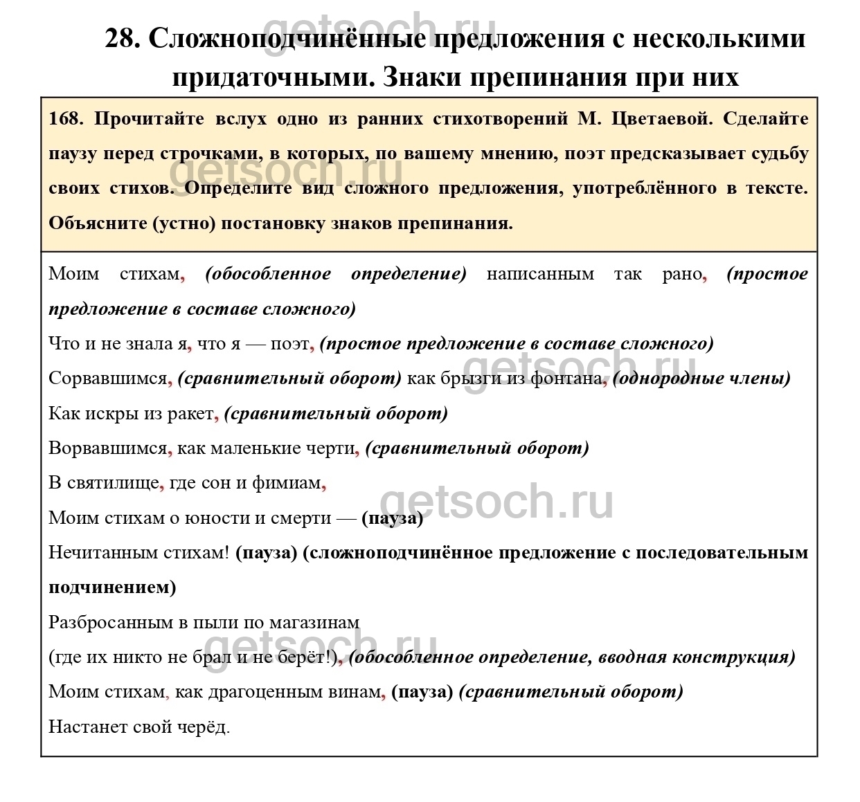 168. Прочитайте вслух одно из ранних стихотворений М. Цветаевой. Сделайте паузу перед строчками, в которых, по вашему мнению, поэт предсказывает судьбу своих стихов. Определите вид сложного предложения, употреблённого в тексте. Объясните (устно) постановку знаков препинания.