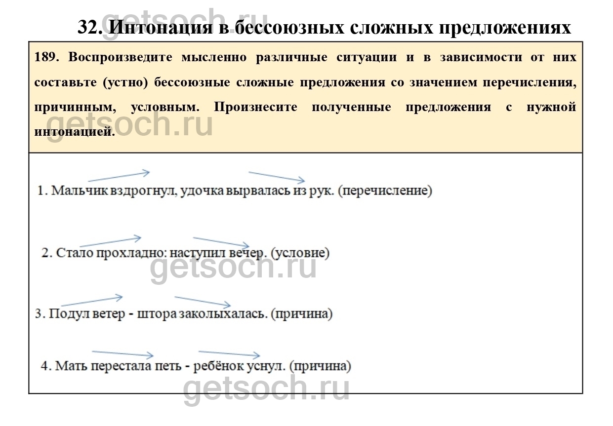 189. Воспроизведите мысленно различные ситуации и в зависимости от них составьте (устно) бессоюзные сложные предложения со значением перечисления, причинным, условным. Произнесите полученные предложения с нужной интонацией.