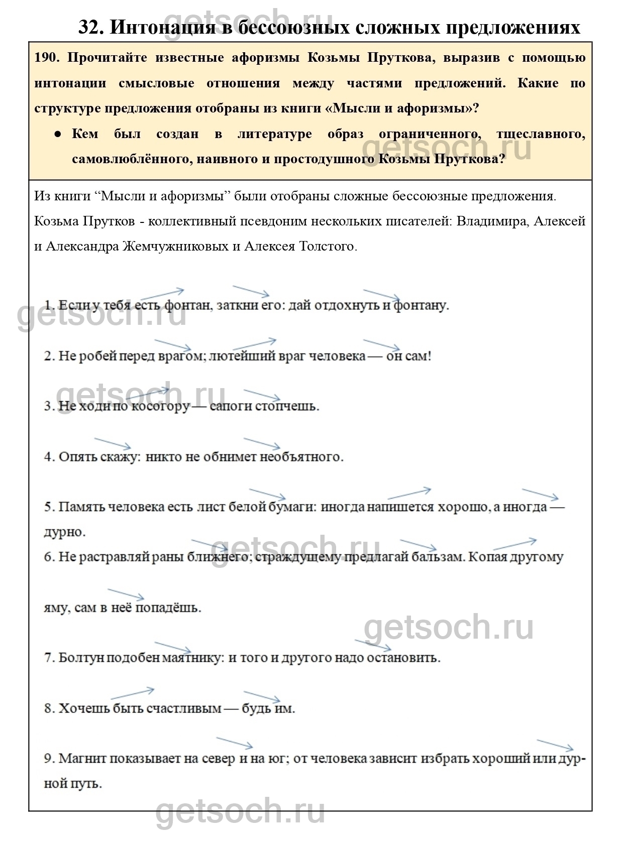 190. Прочитайте известные афоризмы Козьмы Пруткова, выразив с помощью интонации смысловые отношения между частями предложений. Какие по структуре предложения отобраны из книги «Мысли и афоризмы»?