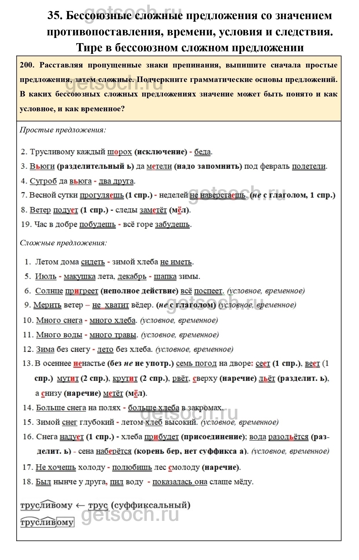 200. Расставляя пропущенные знаки препинания, выпишите сначала простые предложения, затем сложные. Подчеркните грамматические основы предложений. В каких бессоюзных сложных предложениях значение может быть понято и как условное, и как временное?