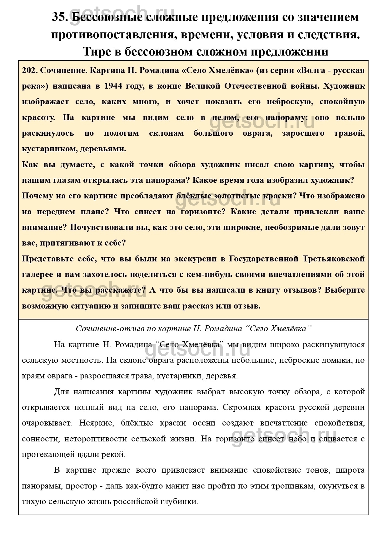 202. Сочинение. Картина Н. Ромадина «Село Хмелёвка» (из серии «Волга – русская река») написана в 1944 году, в конце Великой Отечественной войны. Художник изображает село, каких много, и хочет показать его неброскую, спокойную красоту. На картине мы видим село в целом, его панораму: оно вольно раскинулось по пологим склонам большого оврага, заросшего травой, кустарником, деревьями.