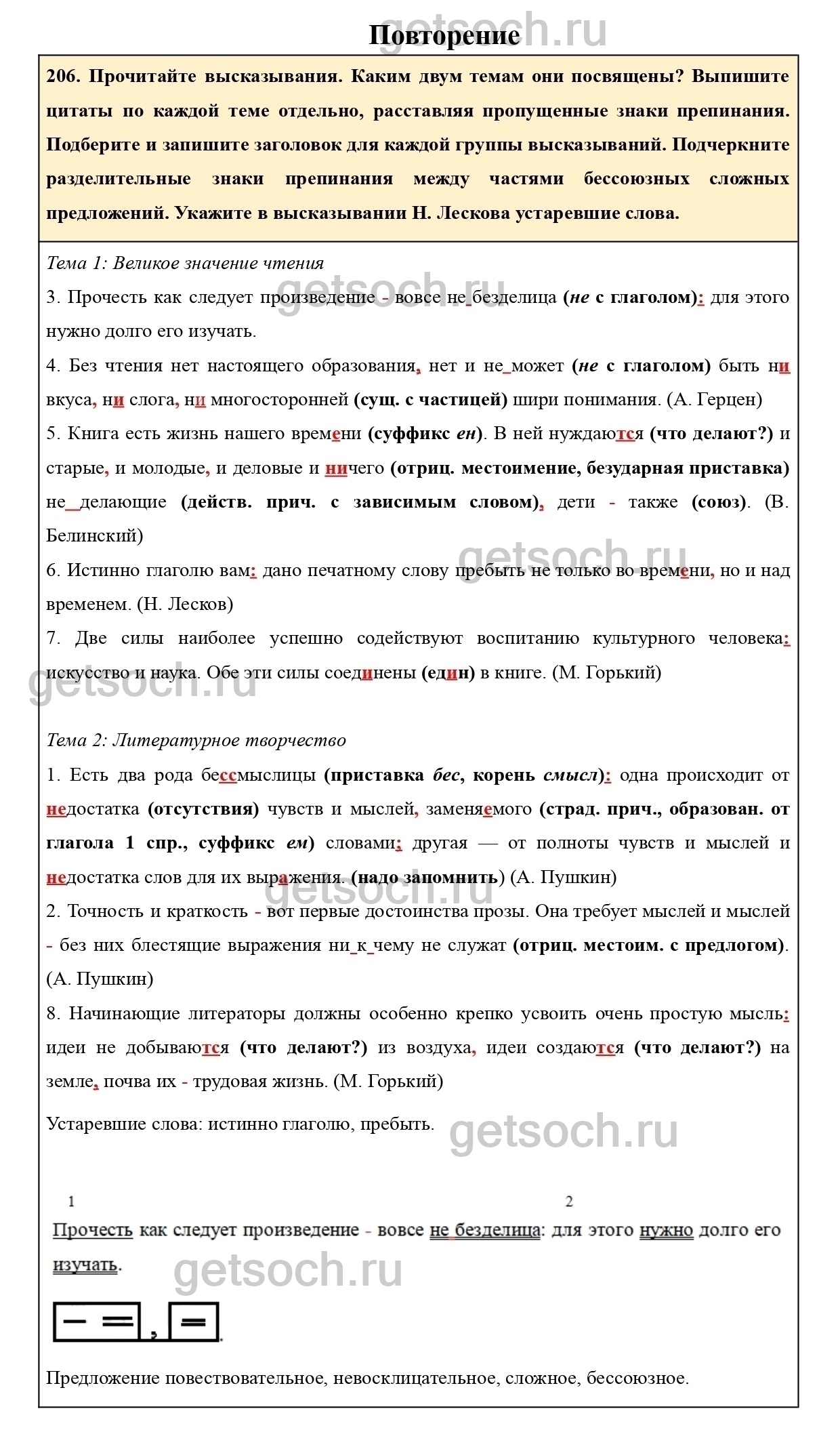 206. Прочитайте высказывания. Каким двум темам они посвящены? Выпишите цитаты по каждой теме отдельно, расставляя пропущенные знаки препинания. Подберите и запишите заголовок для каждой группы высказываний. Подчеркните разделительные знаки препинания между частями бессоюзных сложных предложений. Укажите в высказывании Н. Лескова устаревшие слова.