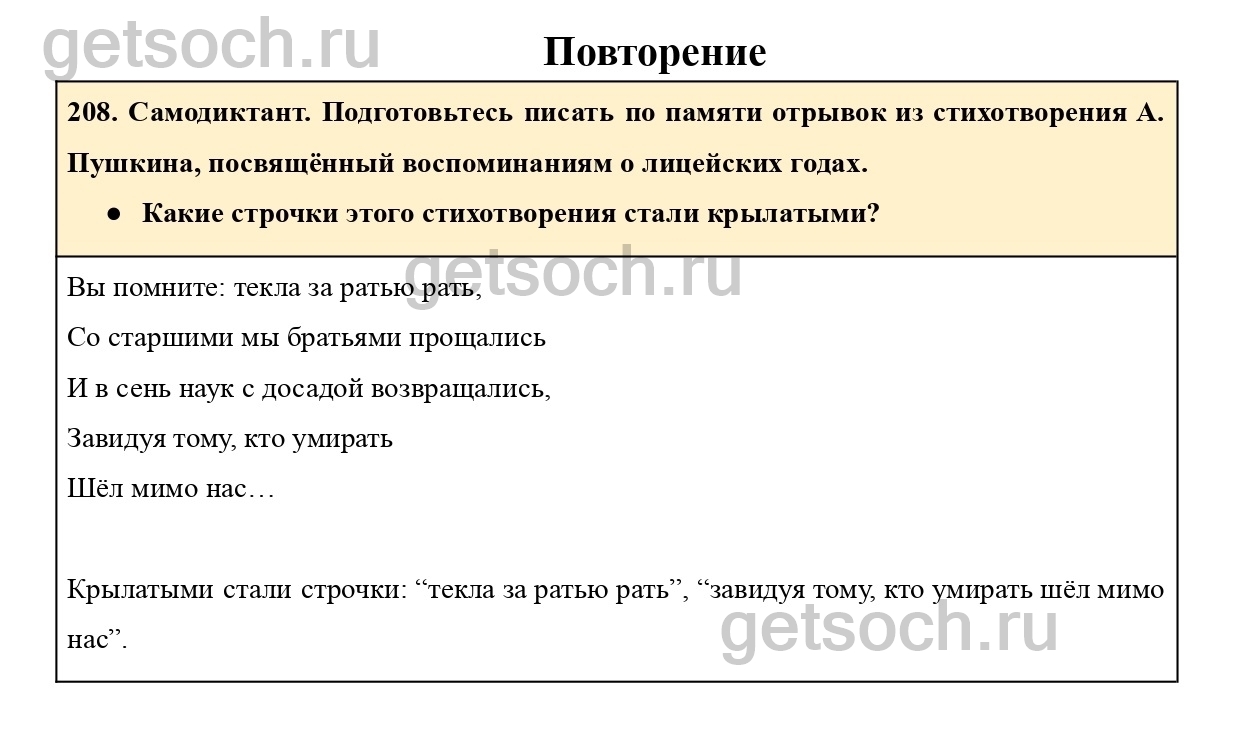 208. Самодиктант. Подготовьтесь писать по памяти отрывок из стихотворения А. Пушкина, посвящённый воспоминаниям о лицейских годах.