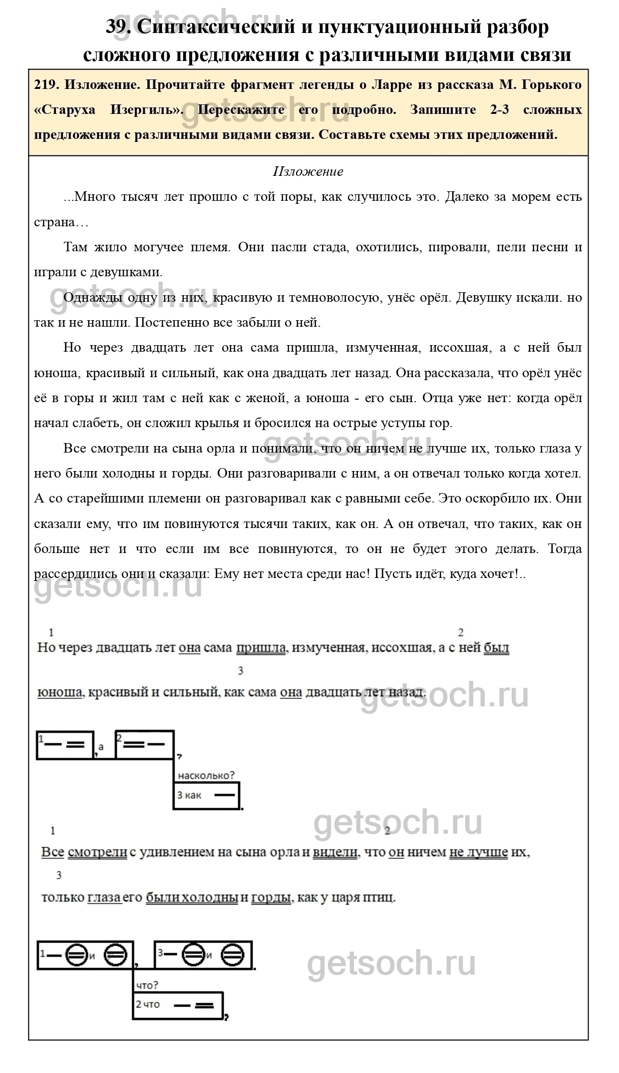 219. Изложение. Прочитайте фрагмент легенды о Ларре из рассказа М. Горького «Старуха Изергиль». Перескажите его подробно. Запишите 2-3 сложных предложения с различными видами связи. Составьте схемы этих предложений.