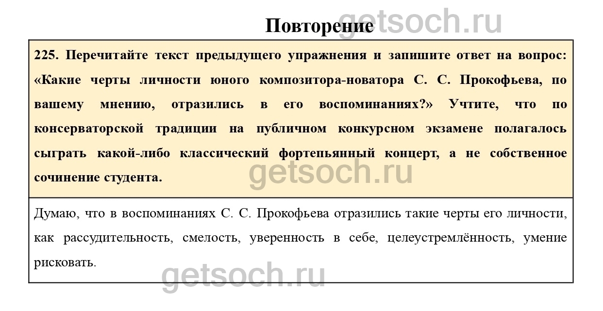 225. Перечитайте текст предыдущего упражнения и запишите ответ на вопрос: «Какие черты личности юного композитора-новатора С. С. Прокофьева, по вашему мнению, отразились в его воспоминаниях?» Учтите, что по консерваторской традиции на публичном конкурсном экзамене полагалось сыграть какой-либо классический фортепьянный концерт, а не собственное сочинение студента.