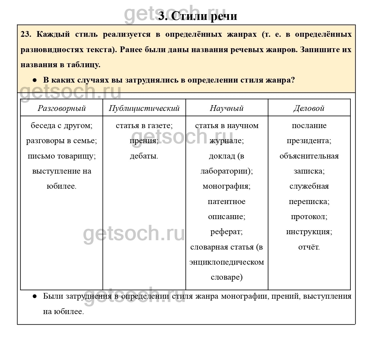 23. Каждый стиль реализуется в определённых жанрах (т. е. в определённых разновидностях текста). Ранее были даны названия речевых жанров. Запишите их названия в таблицу.