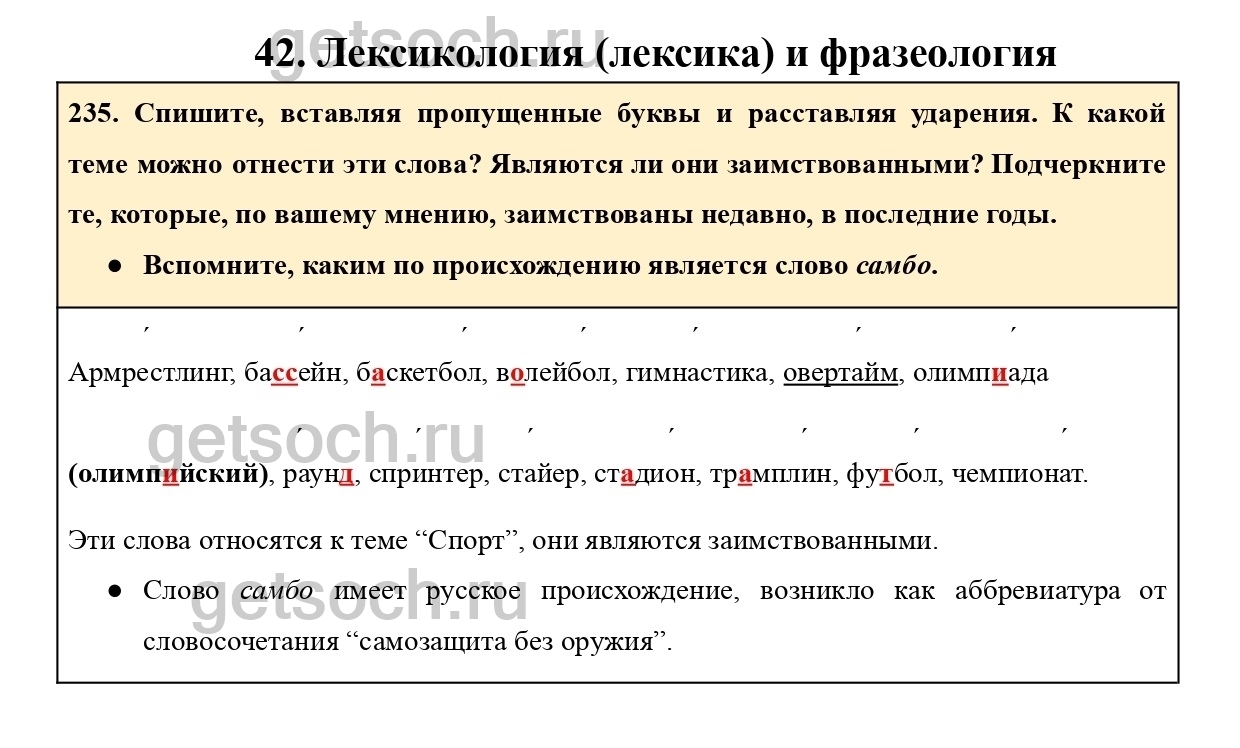 235. Спишите, вставляя пропущенные буквы и расставляя ударения. К какой теме можно отнести эти слова? Являются ли они заимствованными? Подчеркните те, которые, по вашему мнению, заимствованы недавно, в последние годы.
