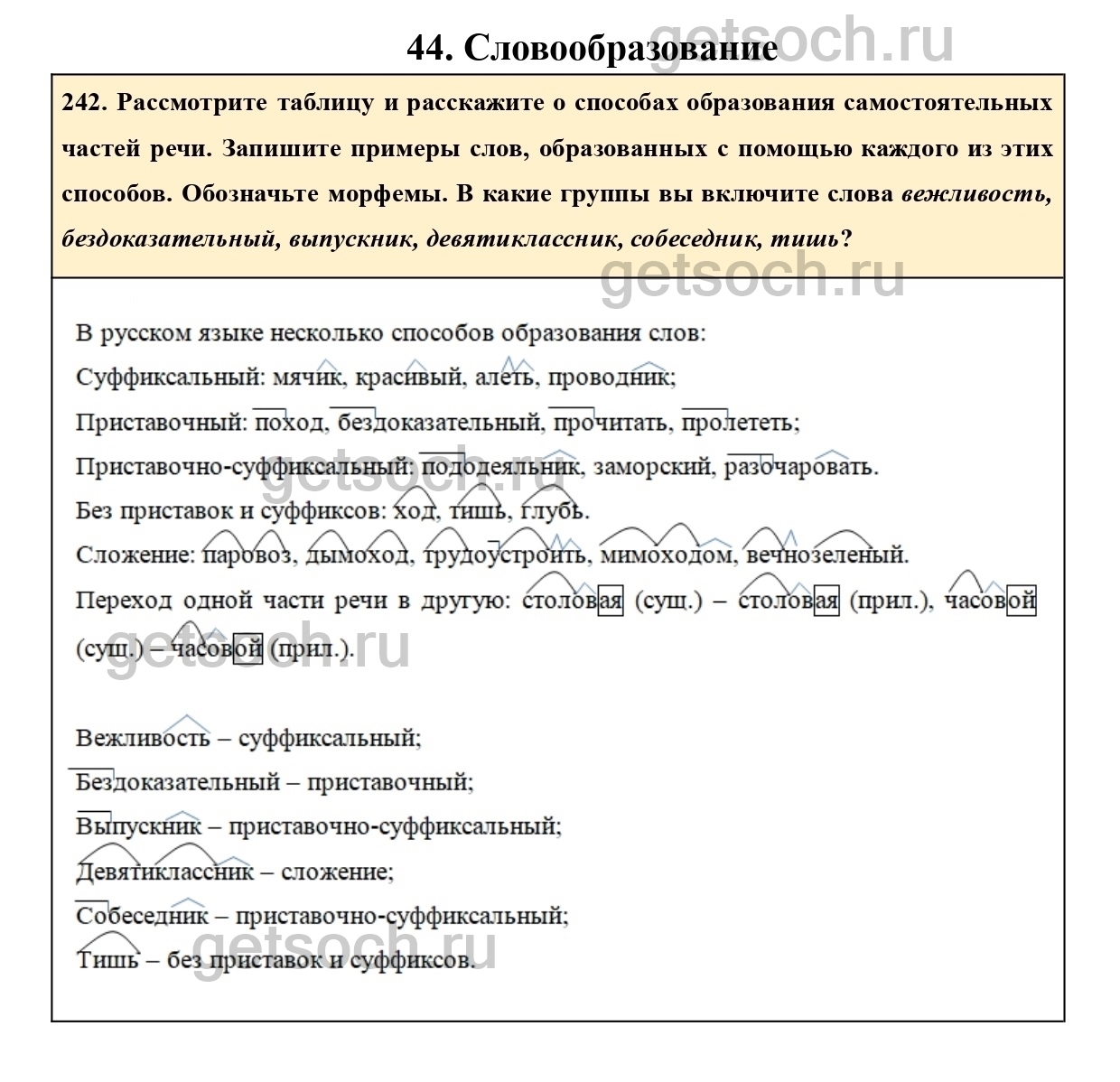 242. Рассмотрите таблицу и расскажите о способах образования самостоятельных частей речи. Запишите примеры слов, образованных с помощью каждого из этих способов. Обозначьте морфемы. В какие группы вы включите слова вежливость, бездоказательный, выпускник, девятиклассник, собеседник, тишь?
