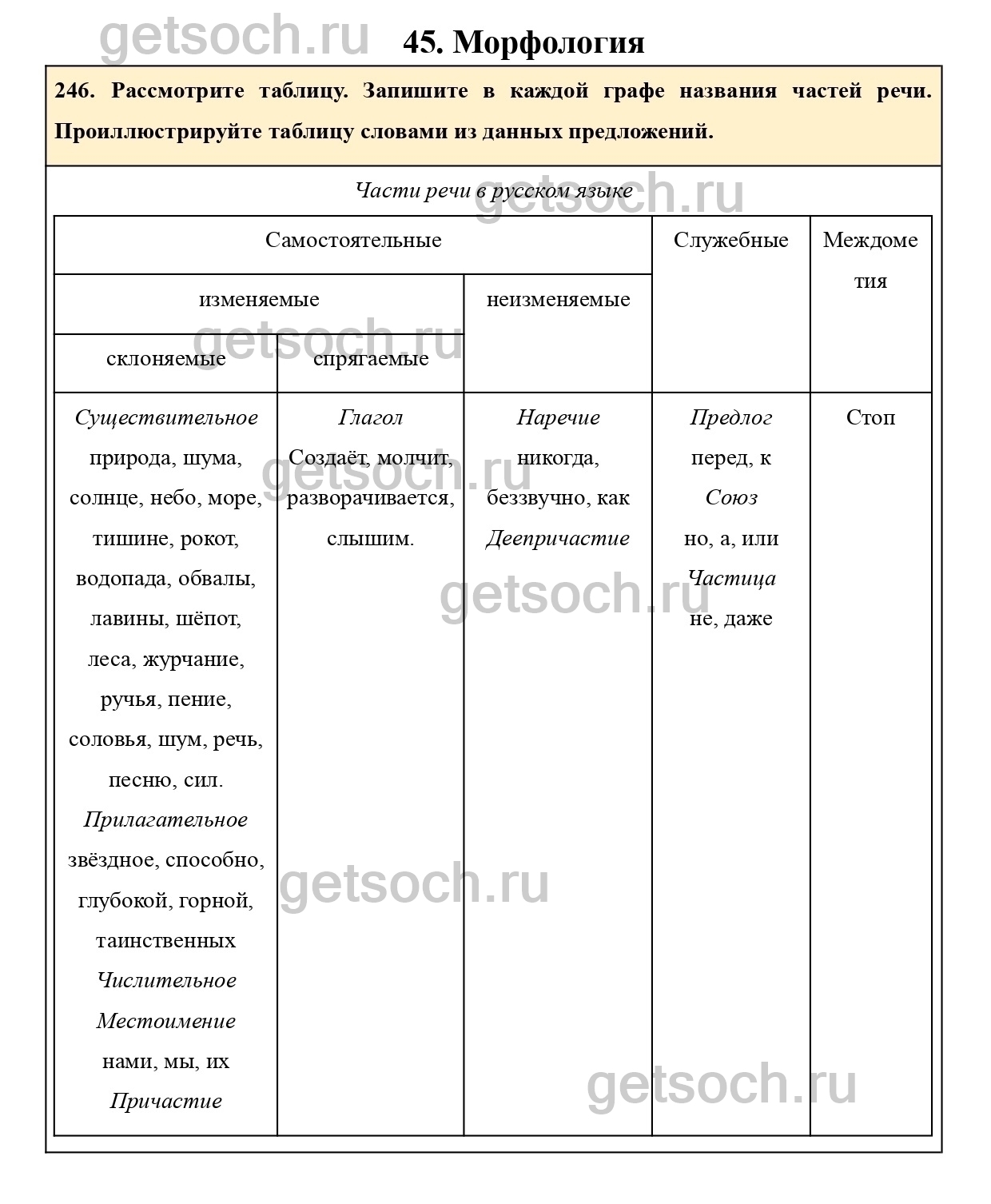 246. Рассмотрите таблицу. Запишите в каждой графе названия частей речи. Проиллюстрируйте таблицу словами из данных предложений.