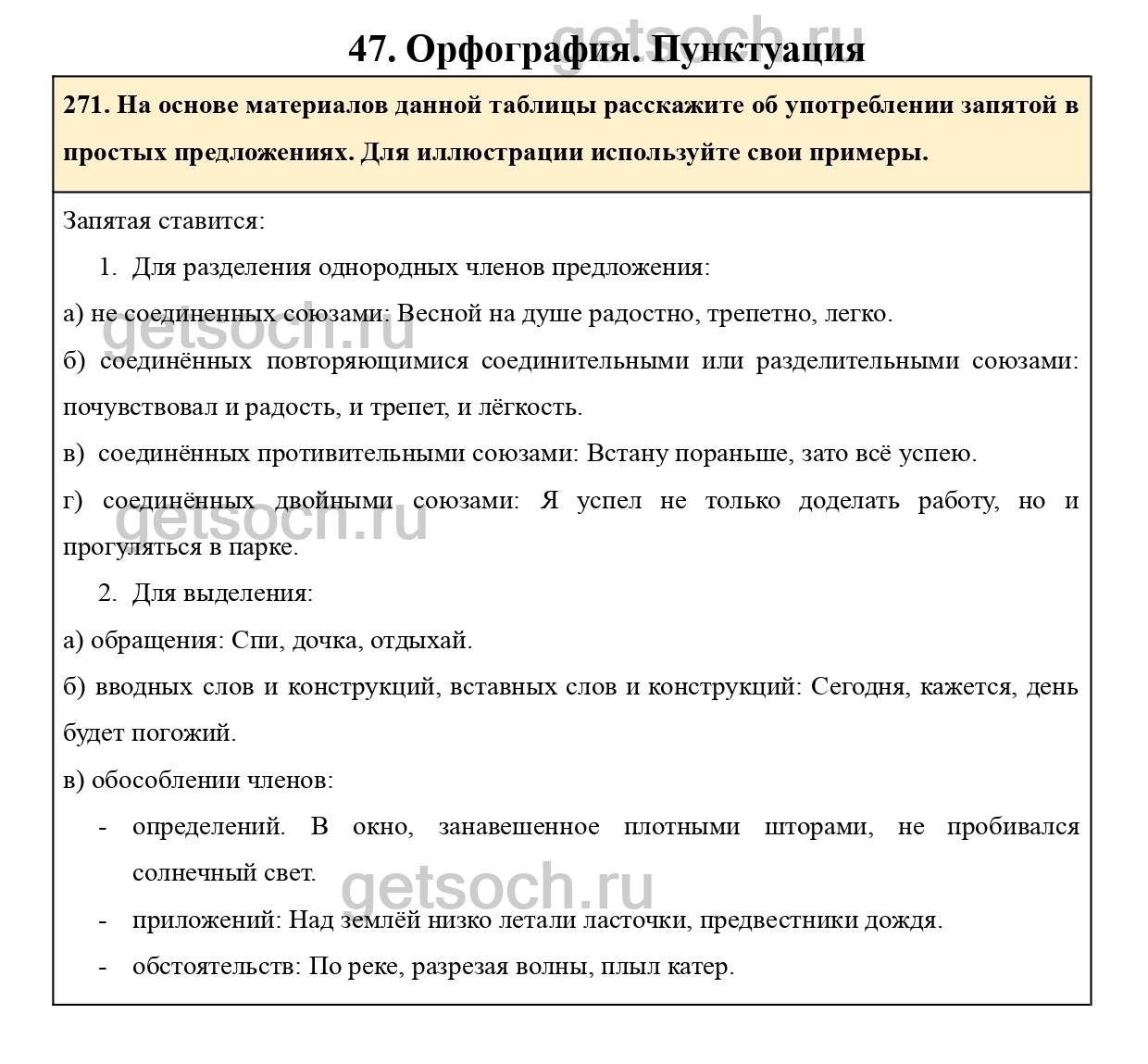 271. На основе материалов данной таблицы расскажите об употреблении запятой в простых предложениях. Для иллюстрации используйте свои примеры.