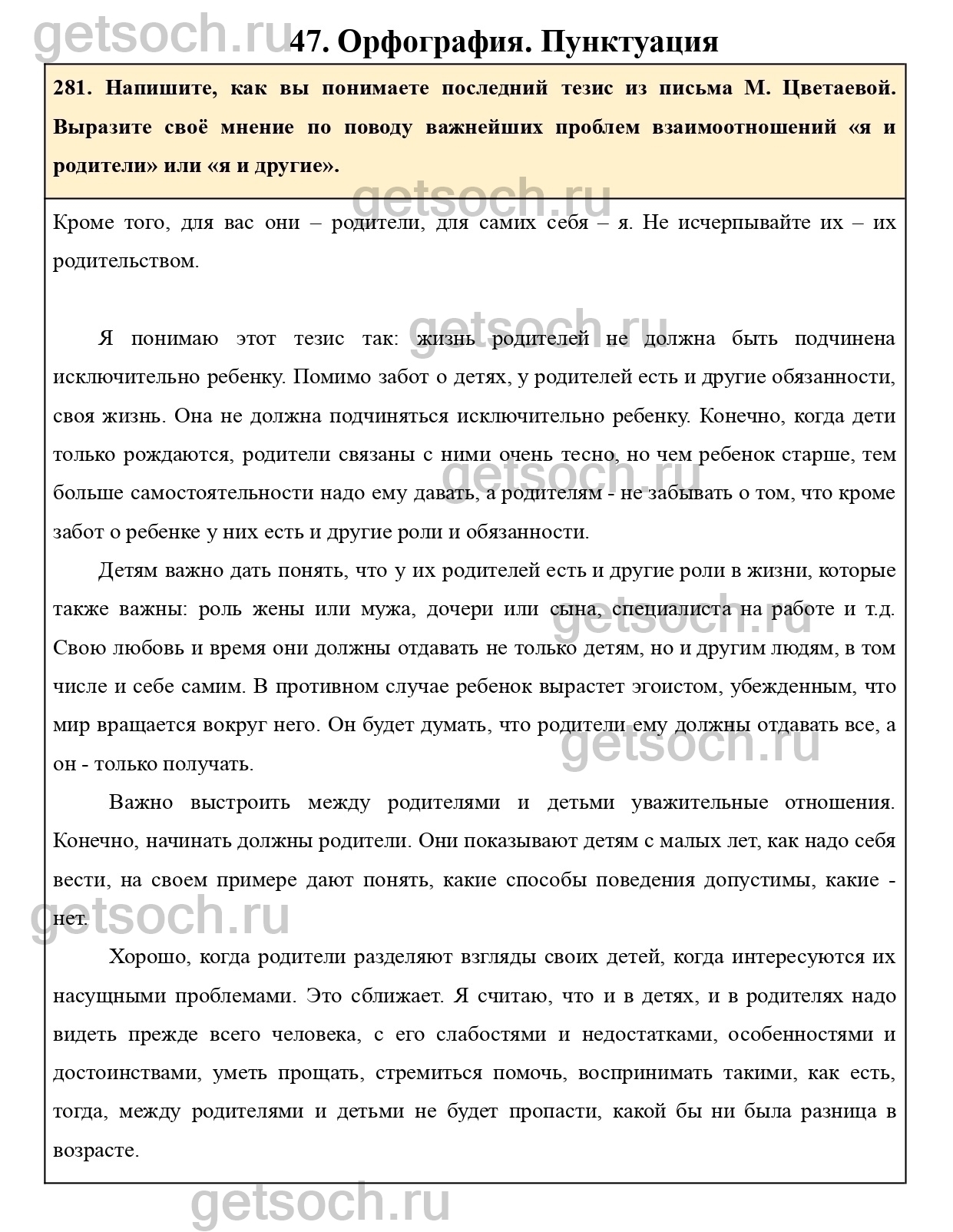 281. Напишите, как вы понимаете последний тезис из письма М. Цветаевой. Выразите своё мнение по поводу важнейших проблем взаимоотношений «я и родители» или «я и другие».